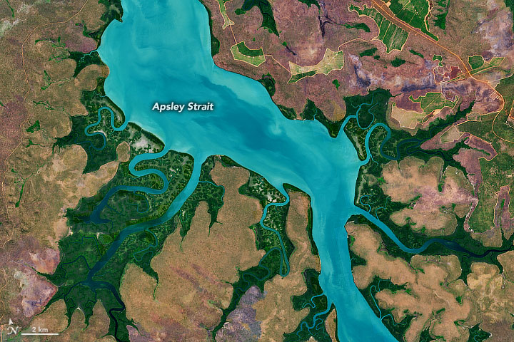 The images on this page show various scenes of the Tiwi Islands, which are part of Australia’s Northern Territory and located about 60 kilometers (40 miles) north of Darwin. Both images were acquired on August 10, 2019, by the Operational Land Imager on the Landsat 8 satellite.
