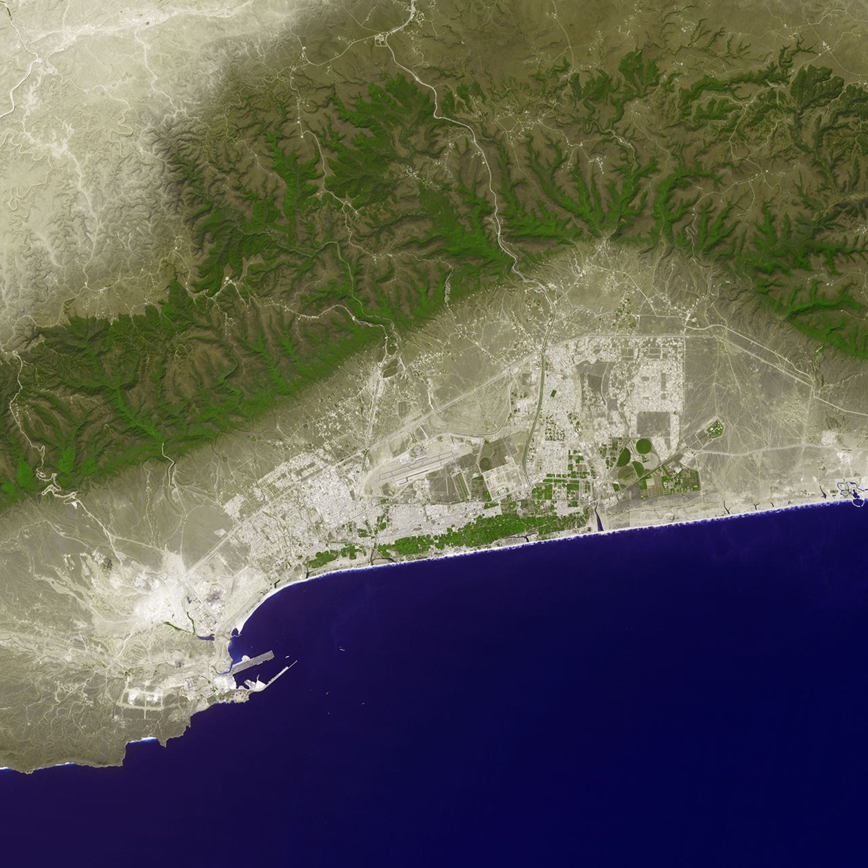 On October 15, 2016, the Advanced Spaceborne Thermal Emission and Reflection Radiometer (ASTER) sensor on NASA’s Terra satellite captured this image of the city. Streams carved a network of channels in the highlands surrounding the city; those highlands have long offered fertile ground for stands of frankincense trees (Boswellia Sacra) and other vegetation. Dried frankincense resin—prized in ancient times as much as gold for its use as incense, religious ceremonies, and funeral rituals—once put this area at the center of global trading routes that connected southern Oman with the rest of the Arabian Peninsula, the Middle East, India, and Asia.