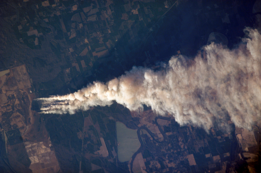 This astronaut photograph captures a 25-kilometer long smoke plume from a fire in the Upper Ouachita National Wildlife Refuge in northeastern Louisiana. The fire started at approximately 1:00 p.m. on January 2, 2006, and this image was acquired approximately three and a half hours later as the International Space Station passed over the Texas-Louisiana border, to the southwest of the scene. The long extent of the plume reflects the strong westerly winds that drove the fire eastwards and damaged an estimated 200-300 acres of the wildlife refuge. The striking illumination of the plume is caused by a very low sun angle (the angle between the horizon and the Sun at the point on the ground directly below the Space Station). Although the plume is well illuminated, the low sun angle results in low illumination of other scene features, such as agricultural fields adjacent to the refuge.
