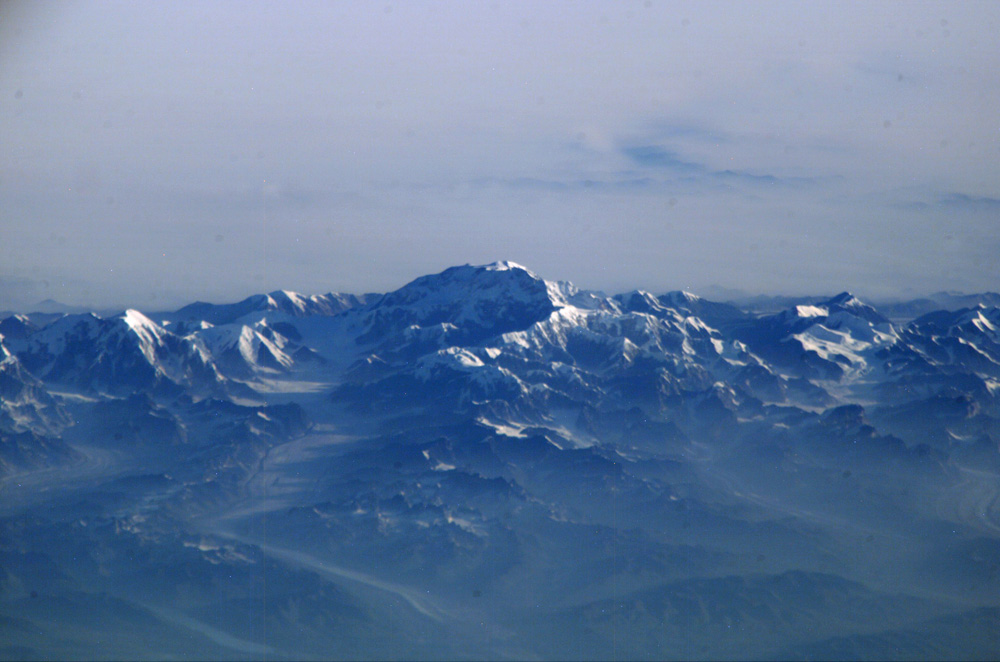 This view of Mt McKinley (Denali)—the highest point in North America (6,194 meters; 20,230 feet)—looks as if it were taken from an aircraft. In fact, an astronaut onboard the International Space Station took advantage of cloud-free skies and a powerful 800-millimeter lens to photograph this peak while the spacecraft was over the Gulf of Alaska, 800 miles to the south of the mountain. The powerful lenses are difficult to use, requiring motion compensation by the astronaut, so these kinds of detailed images of horizon detail are seldom taken. The rising sun casts long shadows across the Kahiltna Glacier that angles down from Denali (left).