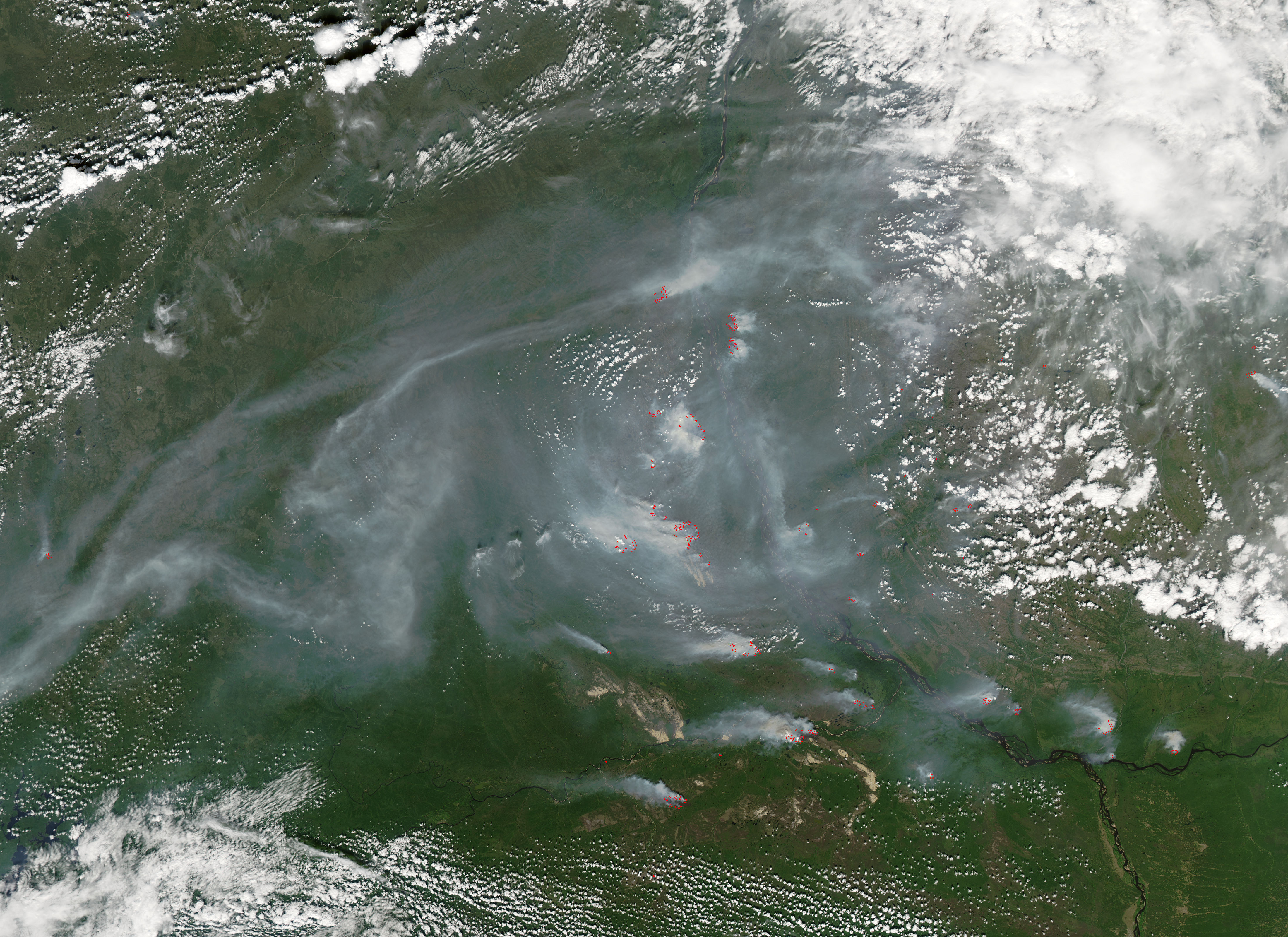On the Central Siberian Plateau, the northeastward direction of the Lena River is turned sharply northward as the river encounters the Verkhoyanskiy Mountains. The river flows northward along the base of the range for several hundreds more miles before emptying into the Arctic Ocean via the Laptev Sea. In the area where the Lena rounds this sharp corner, the Moderate Resolution Imaging Spectroradiometer (MODIS) on NASA’s Aqua satellite detected numerous fires (marked in red) burning in the region’s boreal forests on July 7, 2005.
