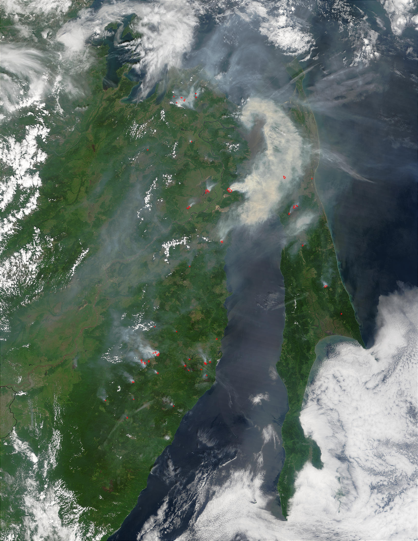 When summer arrives, it’s fire season in places other than the western United States. Lightning from summer thunderstorms triggers the majority of wildfires in Russia’s boreal forests, and these fires can burn the trees and the deep layers of peat soil on the forest floor, releasing huge clouds of smoke. This image of fires (red dots) in eastern Russia was captured by the Moderate Resolution Imaging Spectroradiometer (MODIS) on the Terra satellite on July 17, 2003.