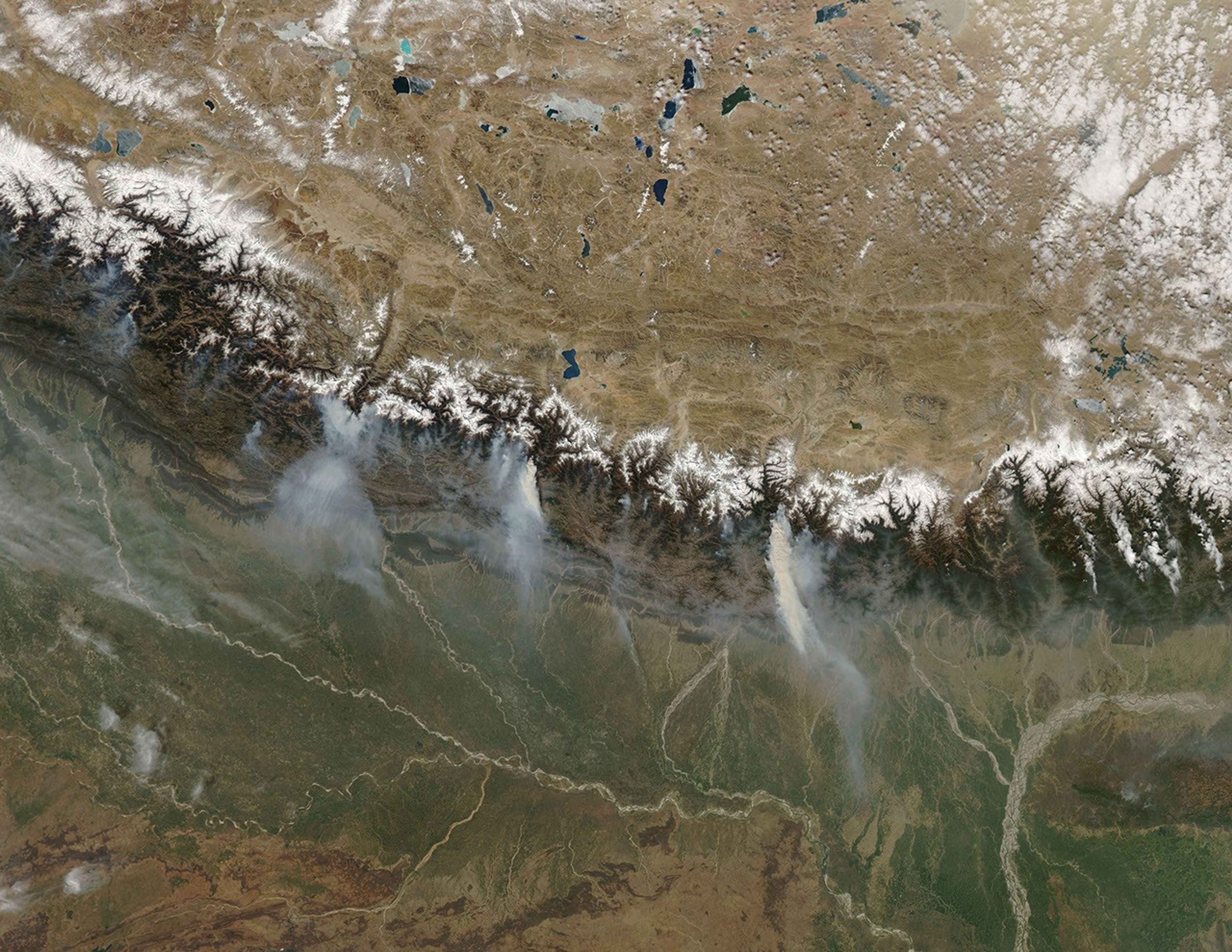 On March 12, 2009, the Moderate Resolution Imaging Spectroradiometer (MODIS) on NASA’s Aqua satellite caught a glimpse of a relatively rare event: large–scale forest fires in the Himalaya Mountains of Nepal. Places where the sensor detected active fires are outlined in red. The numerous small fires in southern Nepal may not be wildfires, but rather agricultural or other land-management fires.
