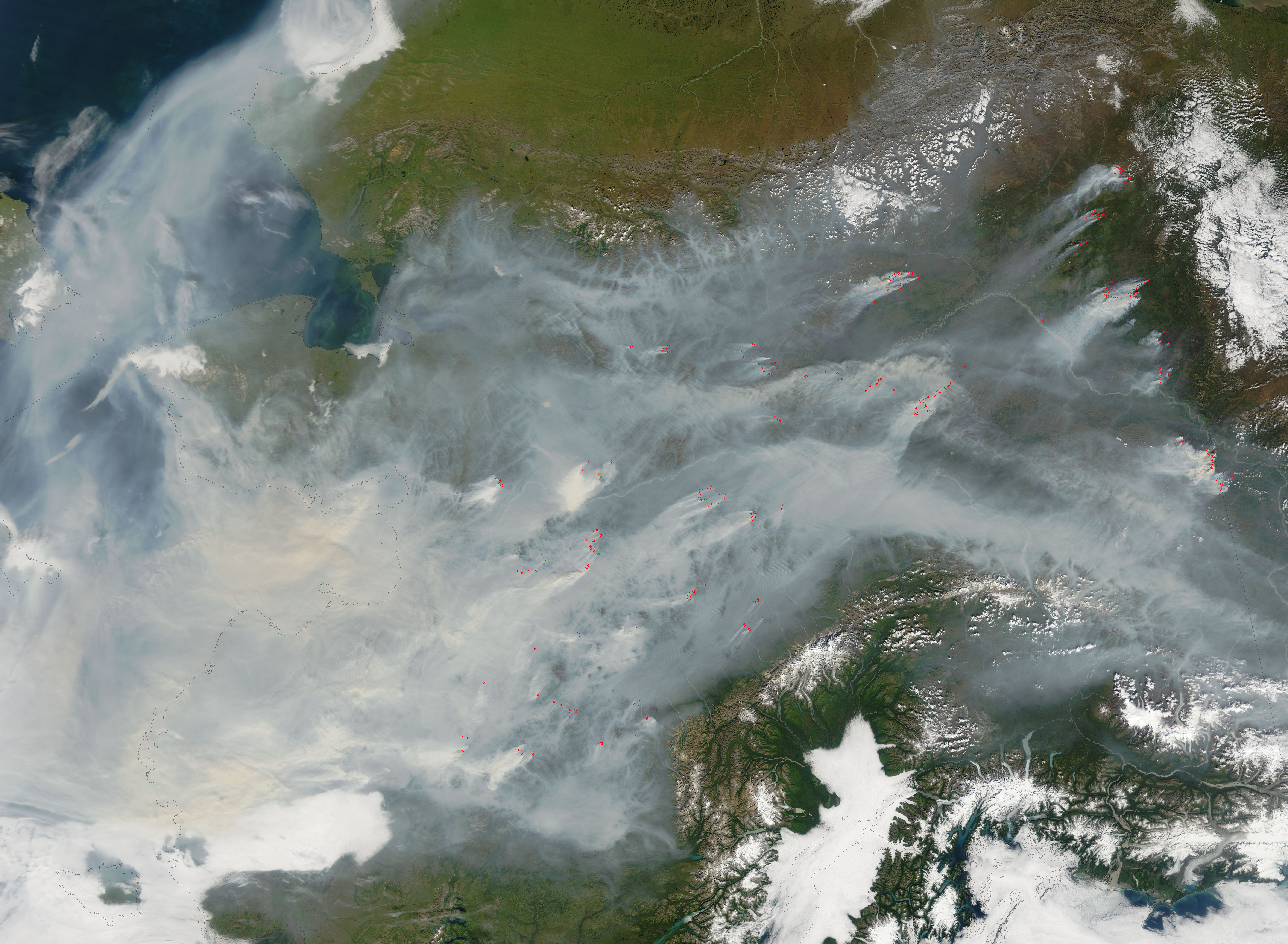 On August 14, 2005, the Moderate Resolution Imaging Spectroradiometer (MODIS) on NASA’s Terra satellite captured this stunning image of forest fires raging across the width of Alaska. Smoke from scores of fires (marked in red) filled the state’s broad central valley and poured out to sea. Hemmed in by mountains to the north and the south, the smoke spreads westward and spills out over the Bering and Chukchi Seas (image left). More than a hundred fires were burning across the state as of August 14.