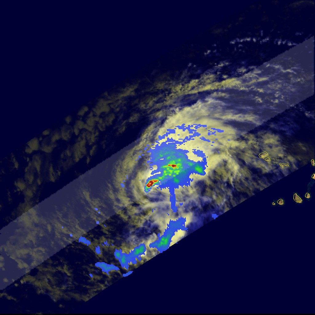 TRMM captured the first image, top left, on July 4, a day after Bertha had become a tropical storm. As shown in the large image, which covers a broader area, the storm was immediately west of the Canary Islands off the coast of West Africa. The cluster of thunderstorms had just started to take a circular shape. While the spots of red indicate there were regions of heavy rain, little organization was evident.