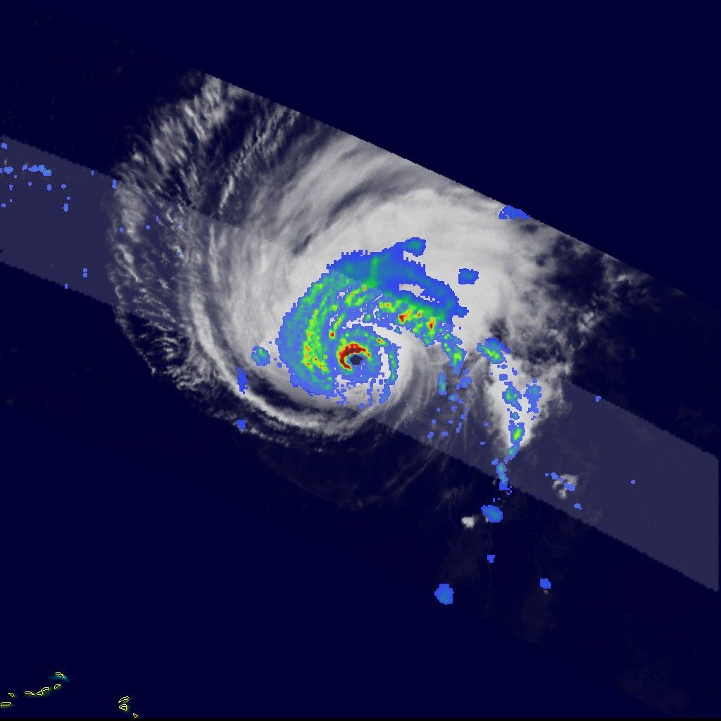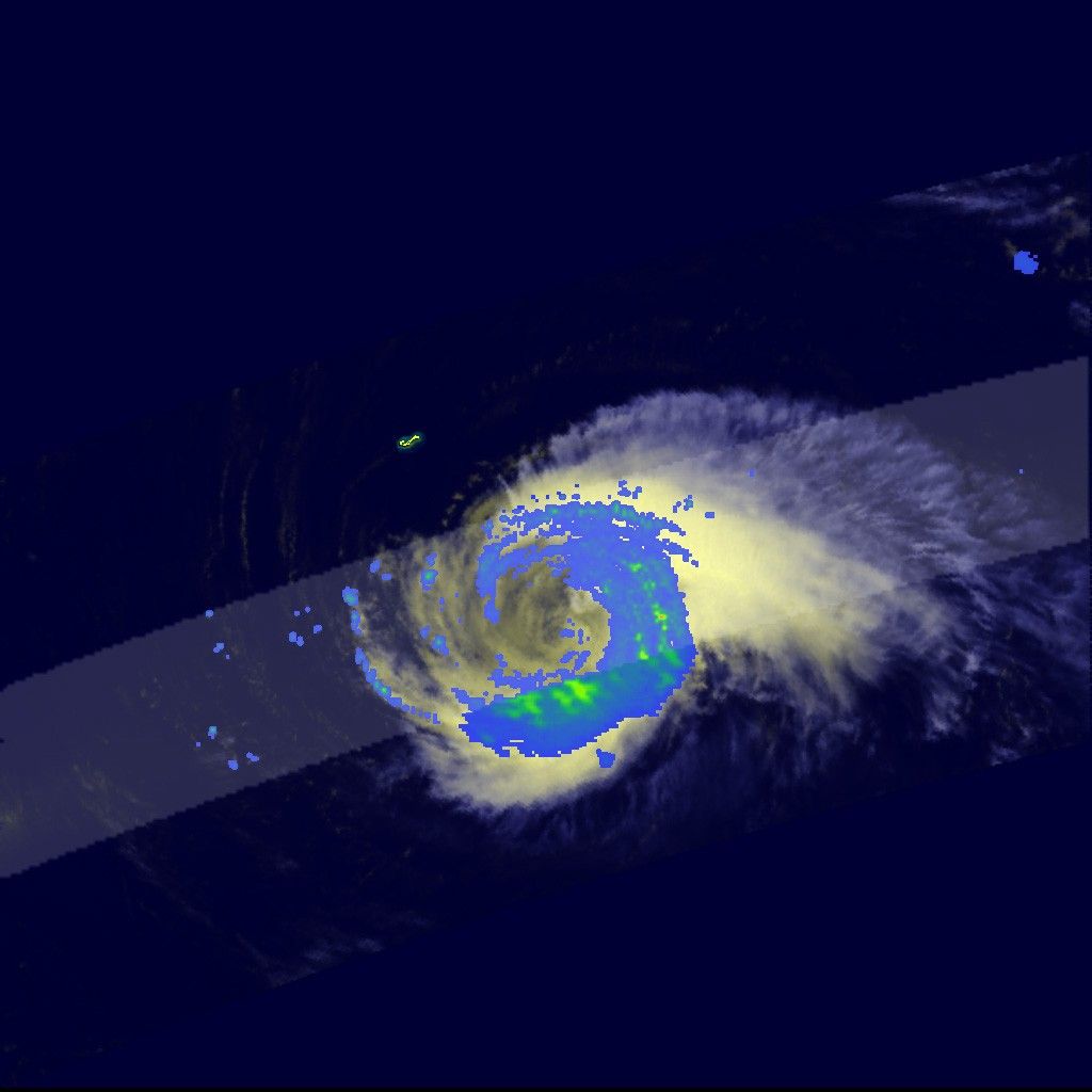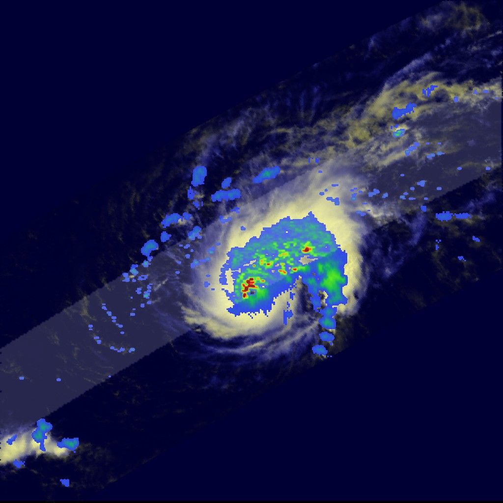 The final image in the series was taken on July 13 at 16:20 UTC (12:20 p.m. EDT). At this stage, the storm was almost completely devoid of rain near its center. Instead, only the remains of the large outer eyewall (as evidenced by the ring of light to moderate rain shown in blue and green, respectively), wrapped around the eastern side of the storm. This is typically where the strongest winds reside, which at this time were estimated at 100 km/hr (63 mph or 55 knots) by the National Hurricane Center.