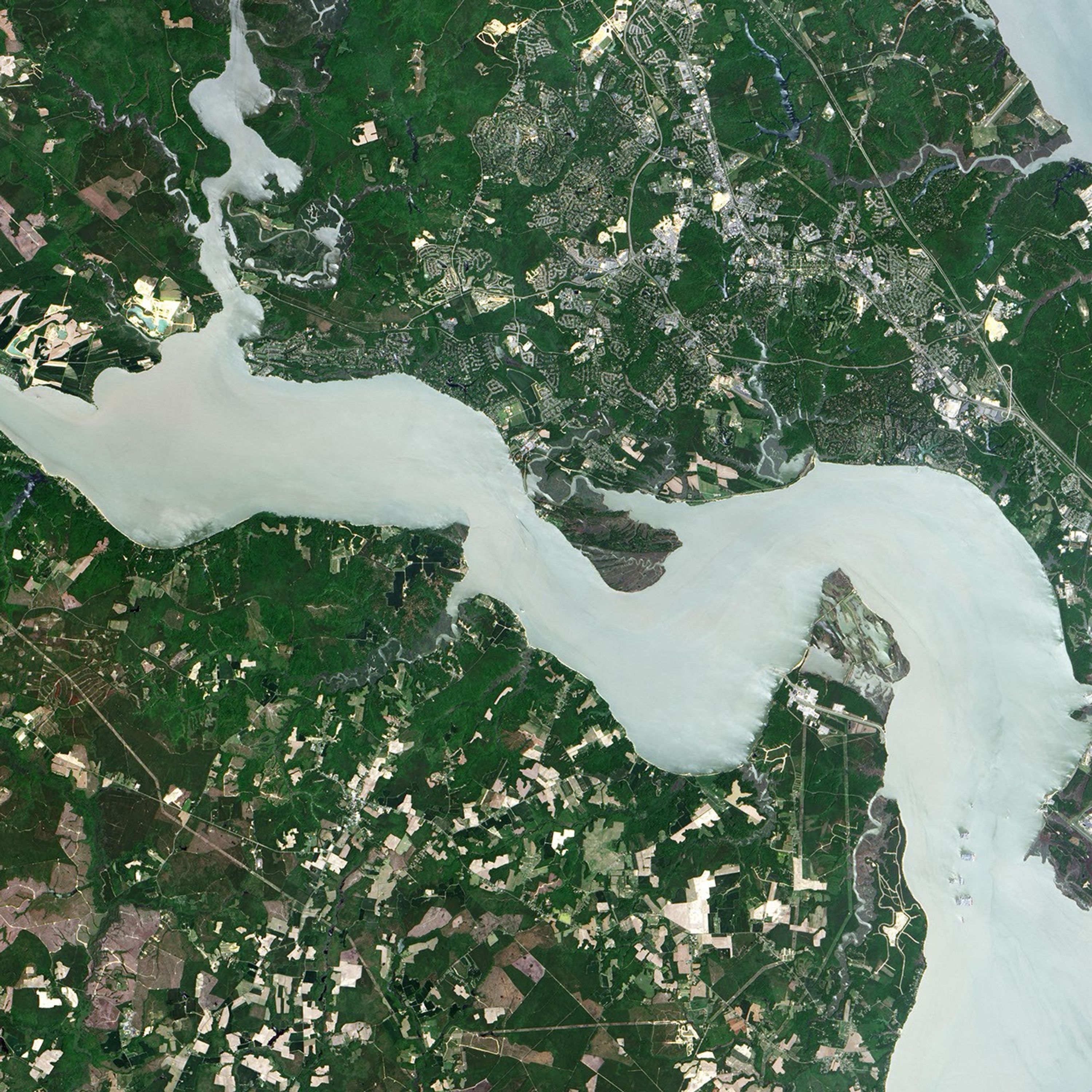 One of the most striking features of this image is a distinct line running across the southern portion of Jamestown Island, separating forest in the north from low-lying vegetation in the south. South of the line, several dark green fingers of forest reach inland from the western shore. The College of William and Mary describes Virginia’s coastal plain as a “terraced landscape that stair-steps down to the coast and to the major rivers.” The thick forest in the north sits on land at a higher elevation, and the stands of trees along the southwestern shore likely also rest on ridges of higher land separated by river bottoms and developing bays.