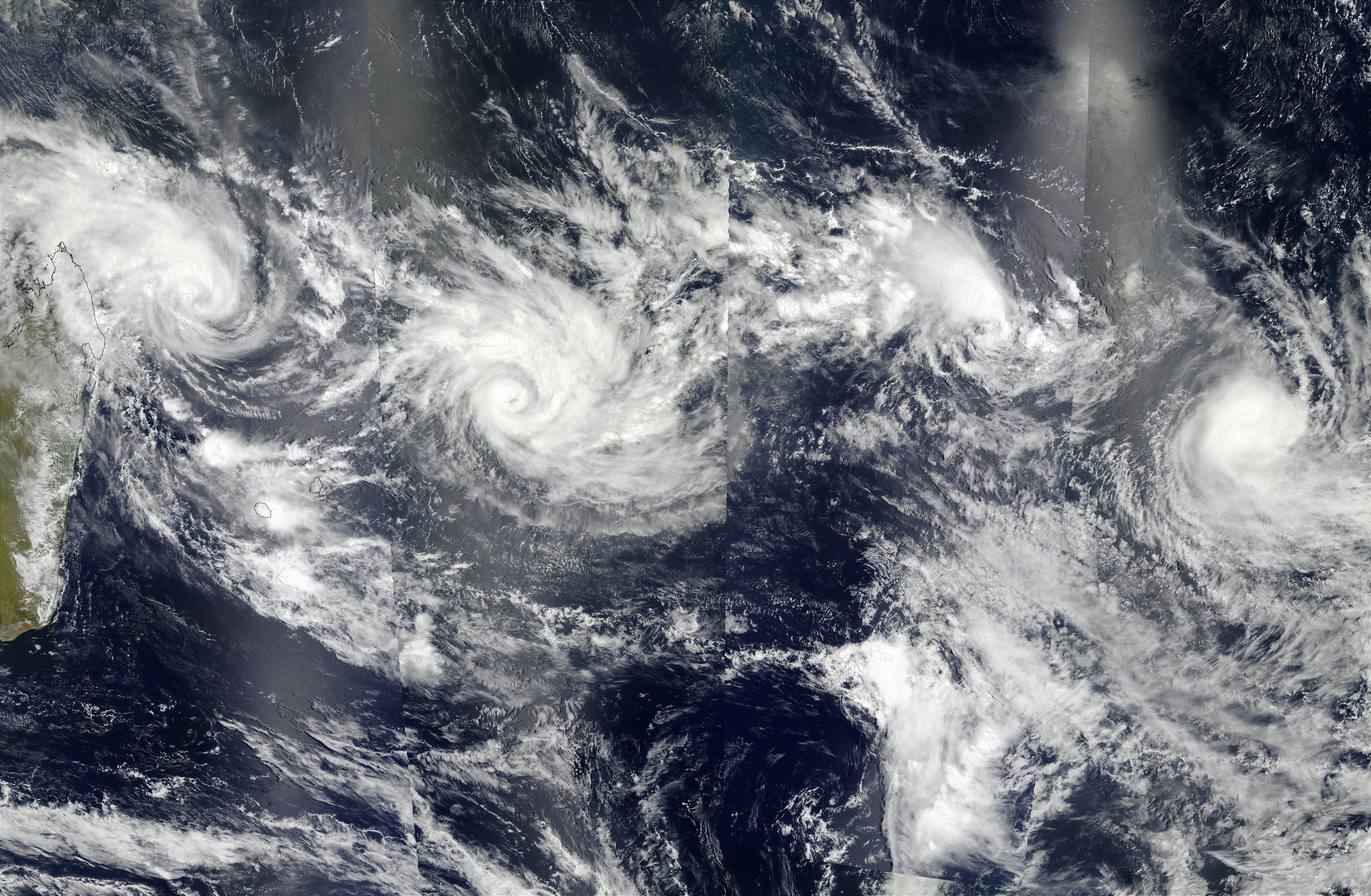 In the southern Indian Ocean east of southern Africa and Madagascar (left), a train of four tropical cyclones has been captured in this true-color image made from observations collected by alternating passes of the Aqua and Terra satellites. The cyclones pictured are (west to east) Gerry, Hape, 18S, and Fiona. Each of these storms is in a different stage of development, though all are moving generally east or southeast. As of the morning of Feb. 12, Fiona was predicted to weaken and move toward the South Pole; 18S was predicted to intensify slowly as it moved southeast; Hape was predicted to move eastward and intensify; and Gerry was predicted to maintain its current intensity and move southeast.