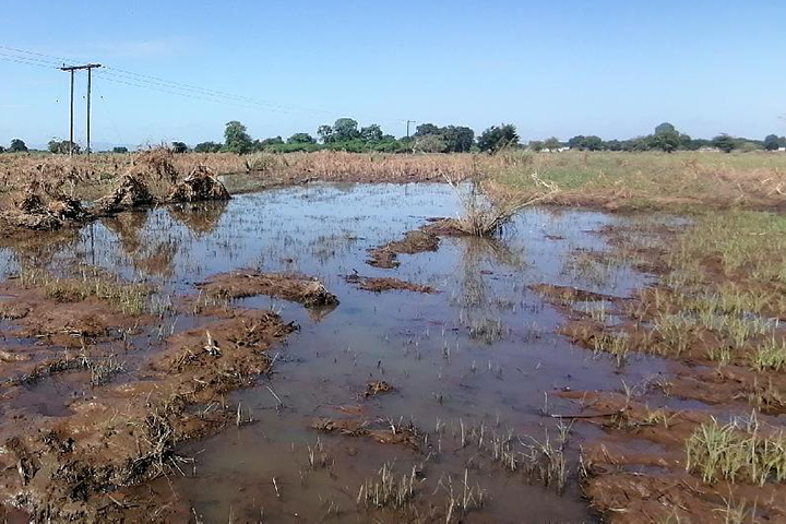 In some areas, floodwaters swept crops away and left bare, muddy fields behind. In others, the decomposing remains of plants killed or damaged by waterlogging remained rooted in the ground. The storm hit just before farmers were about to harvest the maize crop. The photographs show washed-out maize (above) and rice (below) fields in Makhanga.
