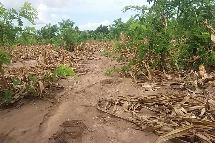 In some areas, floodwaters swept crops away and left bare, muddy fields behind. In others, the decomposing remains of plants killed or damaged by waterlogging remained rooted in the ground. The storm hit just before farmers were about to harvest the maize crop. The photographs show washed-out maize (above) and rice (below) fields in Makhanga.