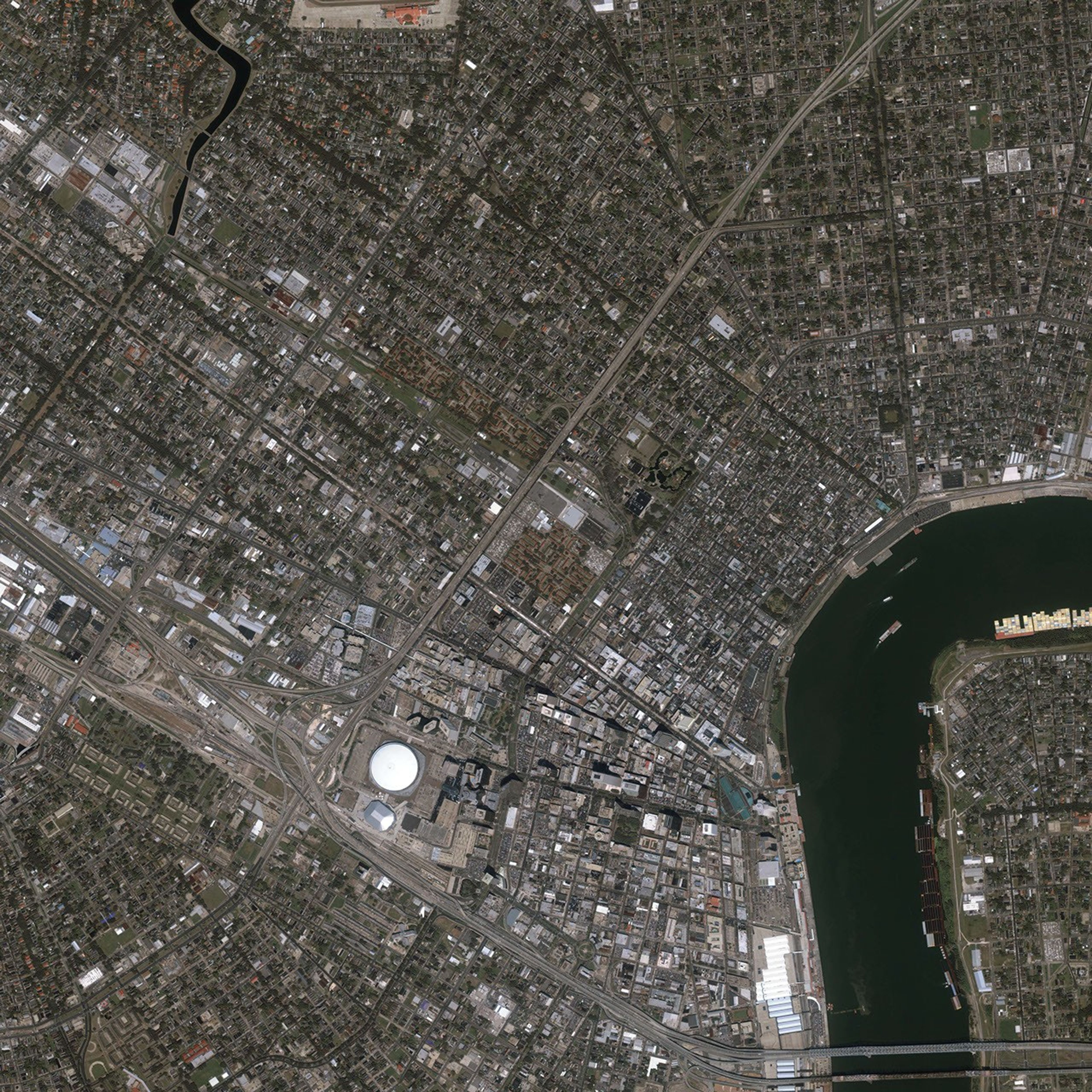 Other New Orleans landmarks are visible in this image. Nearest the river, a block-long red roof marks out the French Market, a mix of community flea market, craft market and open-air farmer’s market. On the other side of Decatur Street, circular landscaping makes Jackson Square easy to identify. At its center—a tiny dot in this image—is a statue of its namesake, Andrew Jackson, the seventh president of the United States and the general who successfully defended the city from British attack during the war of 1812.
