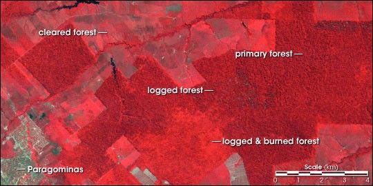 Cochrane and his team looked back at satellite images of deforestation in the Paragominas region of Brazil, one of numerous settlements along the “Arc of Deforestation,” on the developing frontier of the southern Amazon. The obvious deforestation that appears in high-resolution satellite images, such as those from NASA’s Landsat satellite missions, is the basis for Brazil’s assessment of human impact on the forest. Between 1993 and 1995, satellite images suggested a dramatic jump in the rate of Amazonian deforestation. The scientists wanted to know whether that jump might have been due not to intentional, slash-and-burn deforestation, but rather to accidental fire during the 1992 El Niño-induced drought.
