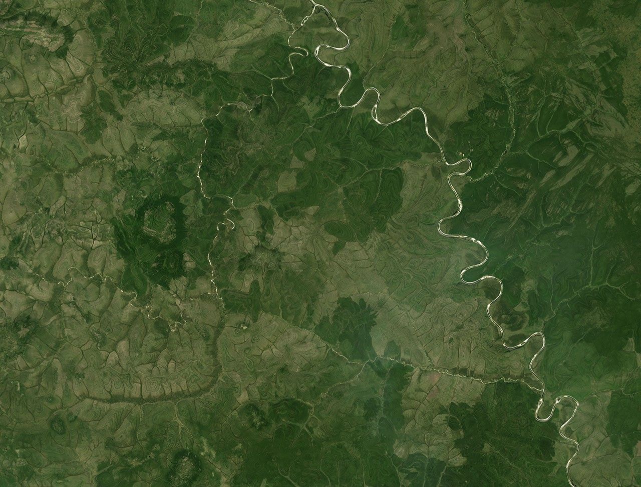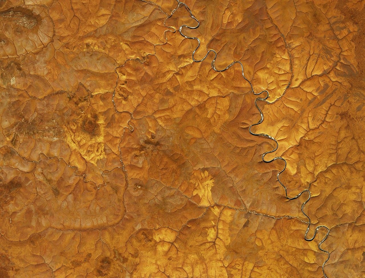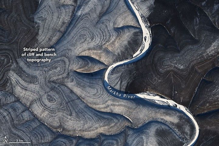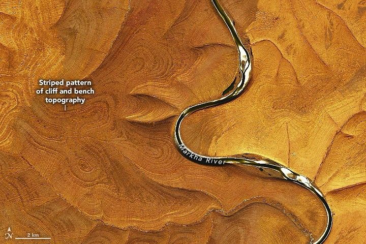Several rivers cut across the plateau, including the Markha, and as the stripe pattern moves closer to the river, it starts to fade. This could be a result of sediment buildup along the riverbanks from millions of years of erosion.