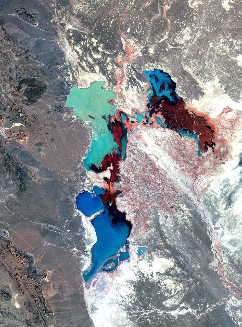 Left: In 1976, the Hamoun wetlands were still thriving. Dense reed beds appear as dark red, while tamarisk thicket fringing the margins of the upper lakes shows up as pink. Bright red patches represent irrigated agriculture, mainly wheat and barley. The lakes flood to an average depth of half a meter denoted by lighter shades of blue, while dark blue to black indicates deeper water s not exceeding four meters. Landsat MSS false color composite (bands 4, 2, and 1). Right: By 2001, the Hamoun wetlands had vanished after Central and South Asia were hit by the largest persistent drought anywhere in the world. The only sign of water in this scorched landscape of extensive salt flats (white) is the Chah Nimeh reservoir in the center right of the image, which is now only used for drinking water. Degraded reed stands in muddy soil are visible as dark red in the southern end of Hamoun-i Puzak. Landsat 7 ETM+ false color composite (bands 4, 3, and 2). (Image courtesy of H. Partow, UNEP)