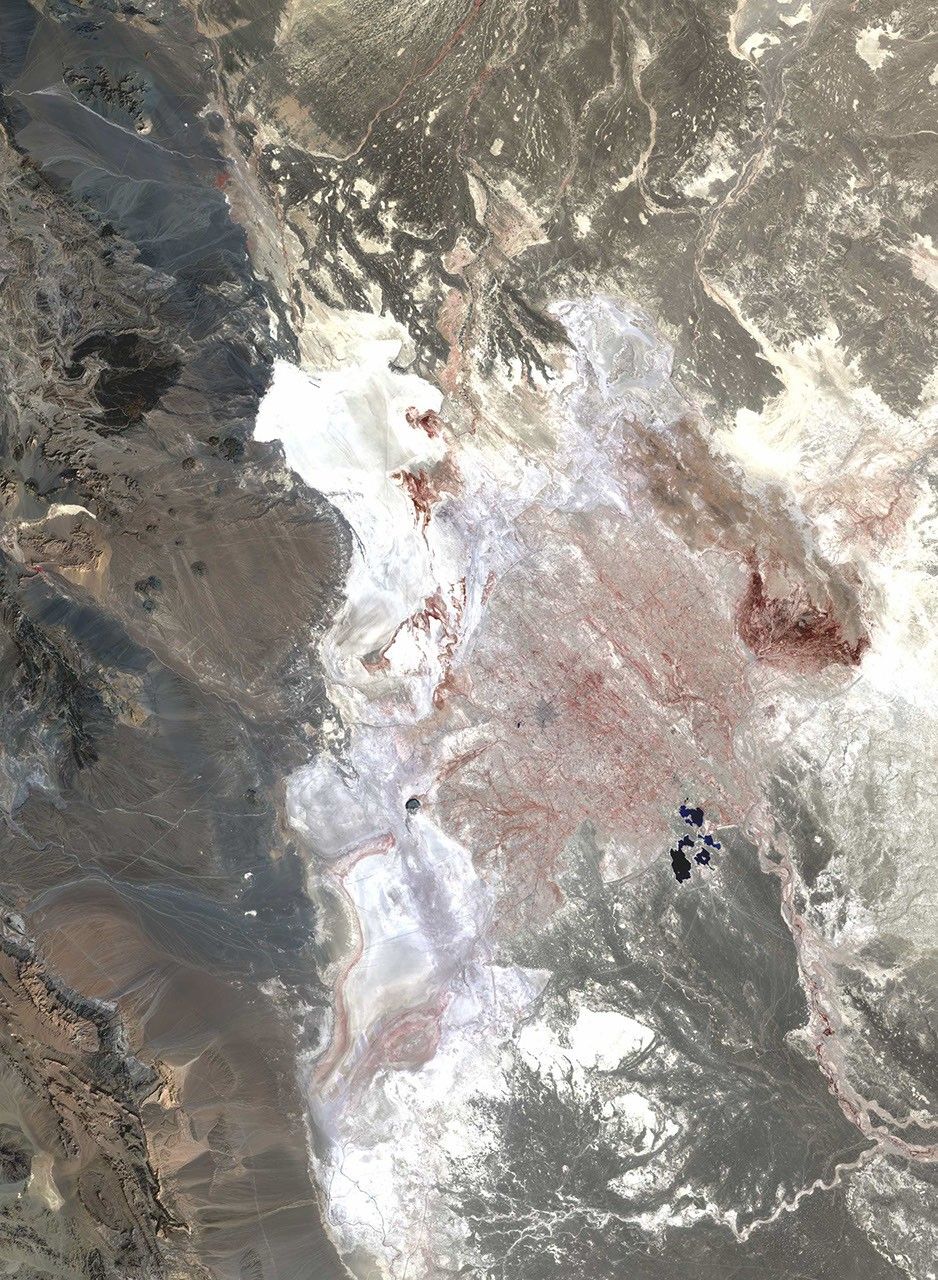 Landsat images reveal present-day and past urbanization. A recently built asphalt highway cuts through the middle of the Ramsar protected area, and the sprawling Iranian border town of Zabol (dark gray) sits in the top right-hand corner. Kuh Khvajeh, a volcanic plug with a flat top that provided the foundation for an ancient settlement, rests in the lower center section of the image. Before the drought, the plug stood as an island in the middle of the marshes. Landsat 7 ETM+ (Bands 8, 7, 4, and 2). (Image courtesy of H. Partow, UNEP)