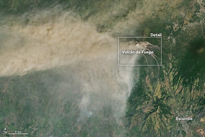 The Guatemalan volcano is at it again, beginning its latest bout of unruly behavior on January 31, 2018. On the next day, the Operational Land Imager (OLI) on Landsat 8 captured these natural-color images of the eruption. Ash in a volcanic plume typically appears brown or gray, while steam appears white. You can see a wider view of the volcano here. Fuego is located about 70 kilometers (40 miles) west of Guatemala City.