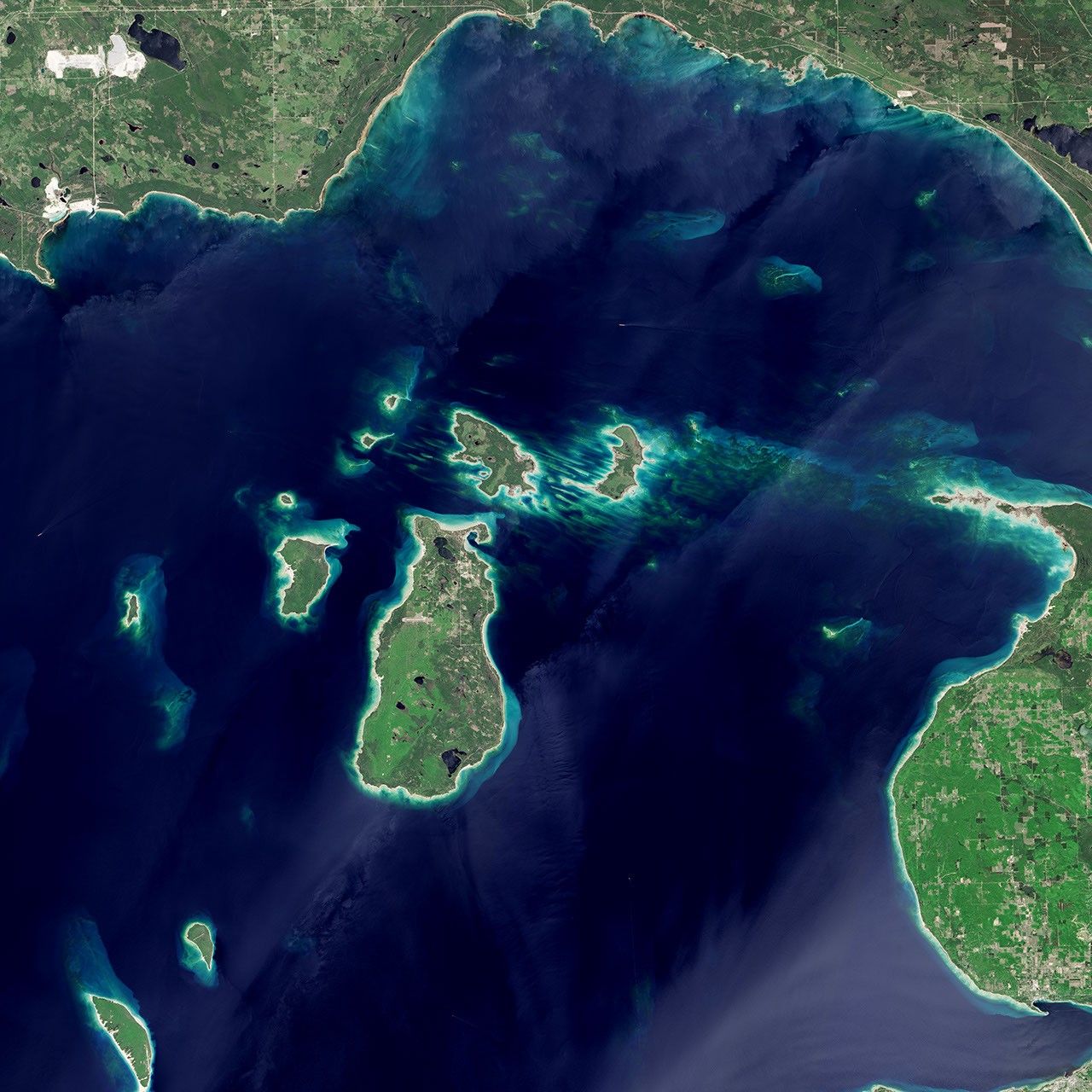 The Operational Land Imager (OLI) on Landsat 8 captured the top image of Garden and Hog islands on May 24, 2013. The lower image, a broader view, shows Beaver Island and the other islands in the context of the great lake. Dense forests, swamps, and sandy beaches dominate the landscape. Offshore, deeper waters appear dark blue, while shallow areas are turquoise.