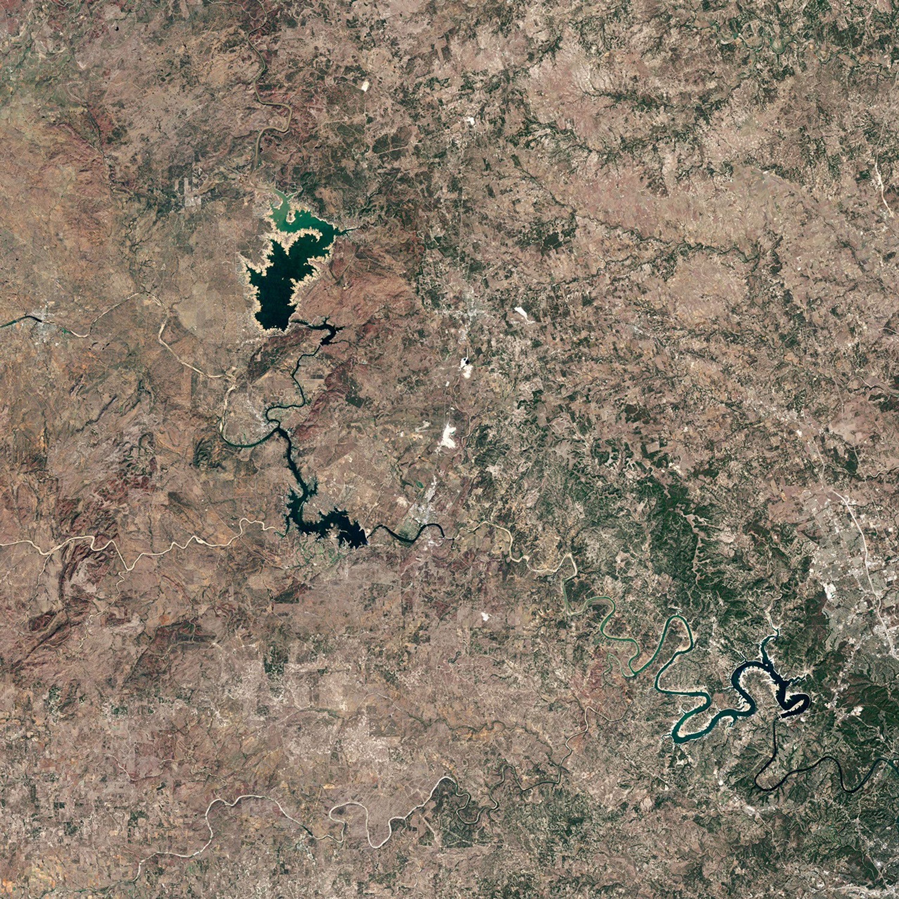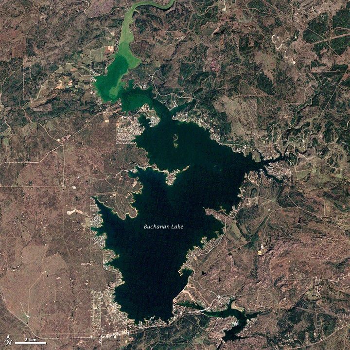 The Thematic Mapper on Landsat 5 captured these images of Lake Buchanan, Texas, in October 2011 and October 2003. Note the distinct, tan “bathtub ring” around the reservoir in 2011, showing exposed lake bed sediments and revealing how far the waterline has dropped from the previous high–water marks. The lake edge is currently as much as a mile from the stone walls that normally protect lakefront homes.