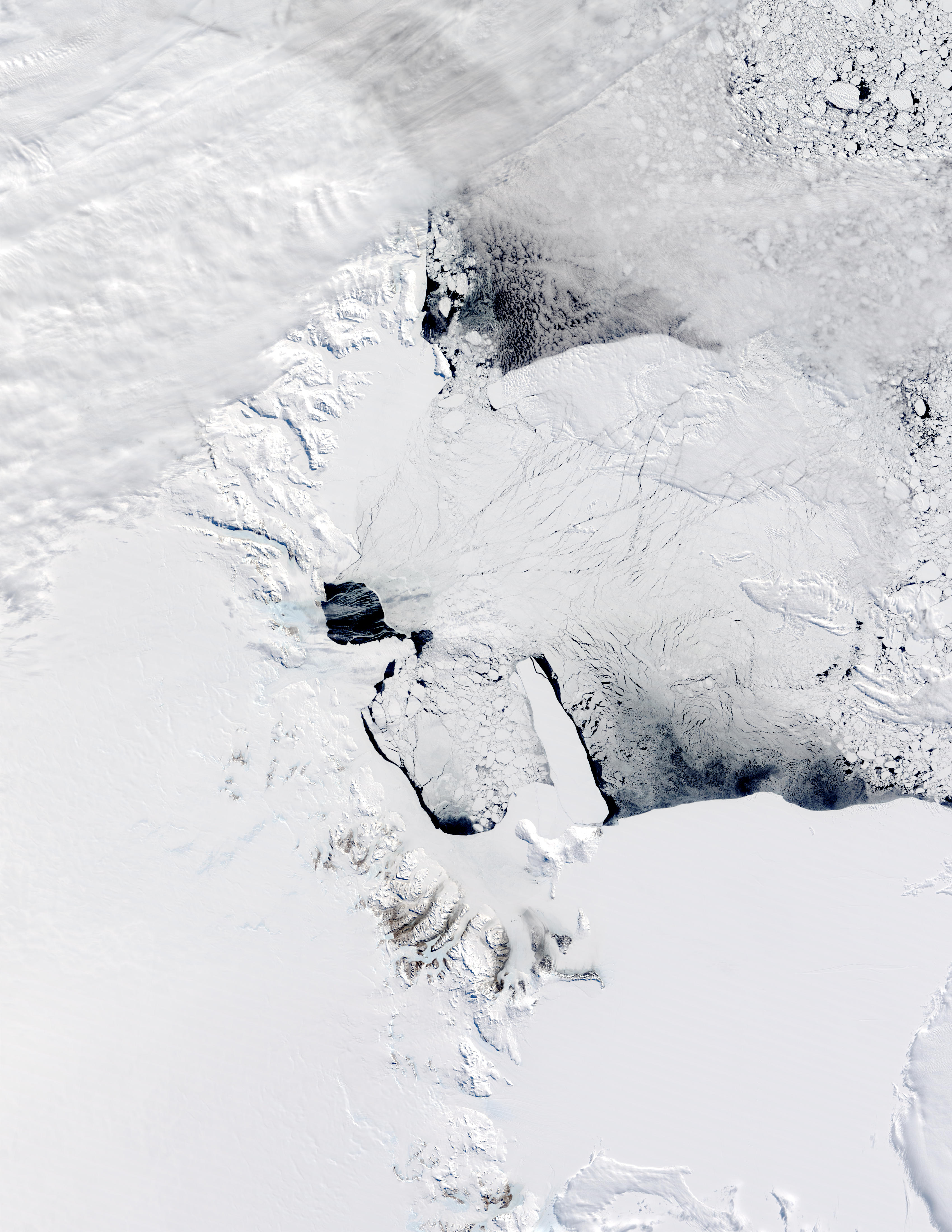 Over the past two and a half years, several unusually large icebergshave calved off of the Ross Ice Shelf in Antarctica. While some havemade their way out into the Pacific Ocean to melt, others continue toshift and float slowly through the Ross Sea. Three of these icebergscan be seen in the above image, taken on November 17, 2002, by theModerate Resolution Imaging Spectroradiometer (MODIS) aboard NASA’sTerra satellite.