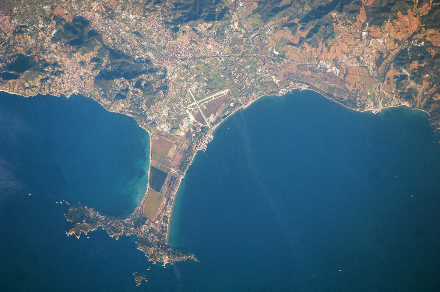 In addition to Giens, three other urban areas are visible in this image: Carqueiranne, Hyères, and La Londe-les-Maures. The urban areas are recognizable by both light pink rooftops and grey street grids. These colors contrast with green to brown vegetated areas, including agricultural fields between Hyères and La Londe-les-Maures and more natural vegetation (dark green) on hills between Hyères and Carqueiranne. Small white dots and streaks in the Mediterranean Sea are yachts and other recreational boats.