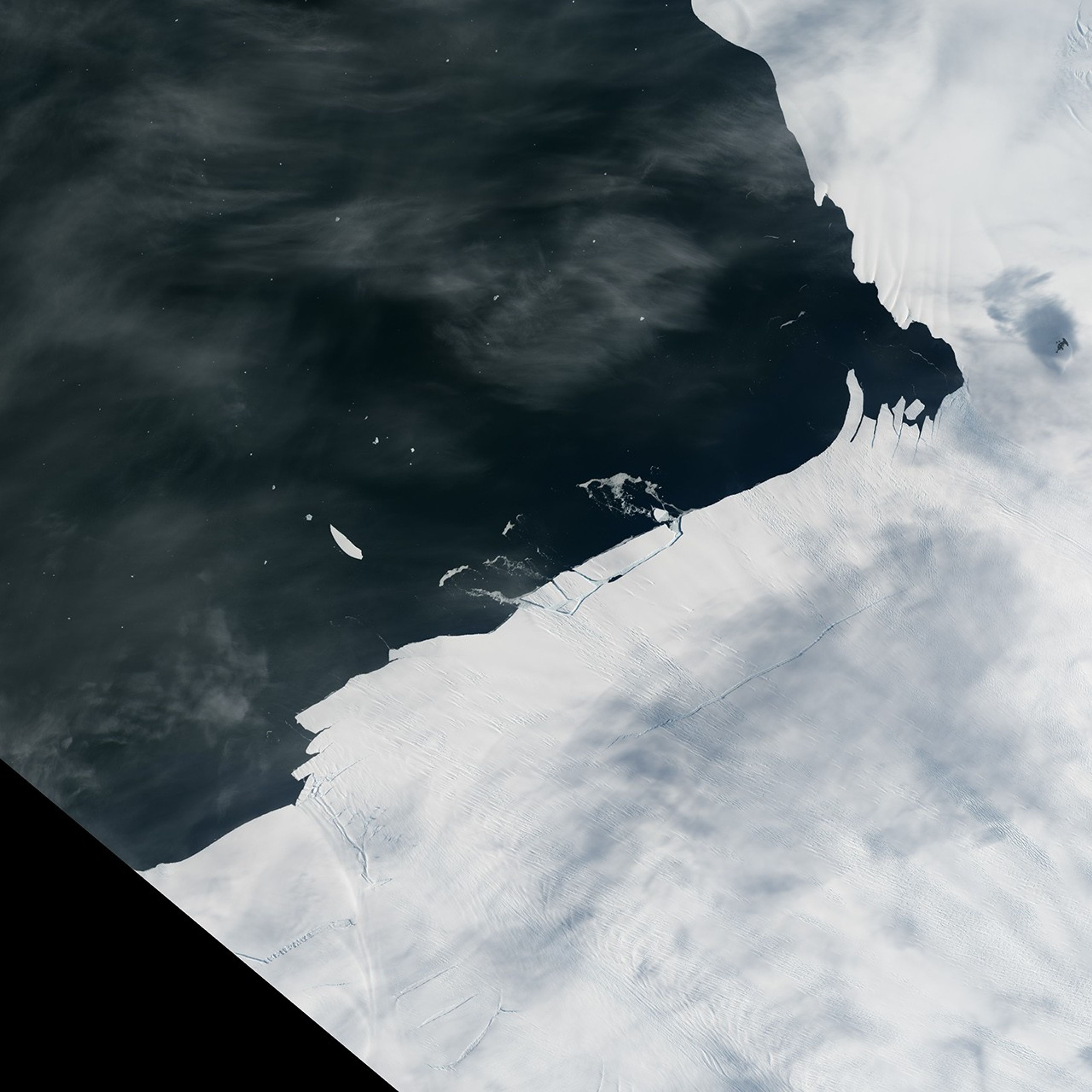 The animation above shows a wider view of the area. The sequence, composed from images acquired January 25–29 by the Moderate Resolution Imaging Spectroradiometer (MODIS) on NASA’s Terra satellite, shows the berg when it first broke and then as it drifts in the bay. According to Ian Howat, a glaciologist at Ohio State University, the event was about 10 times smaller than in July 2015, when a 30-kilometer-long (20-mile) rift developed below the ice surface, then broke through and calved an iceberg spanning 583 square kilometers (225 square miles).