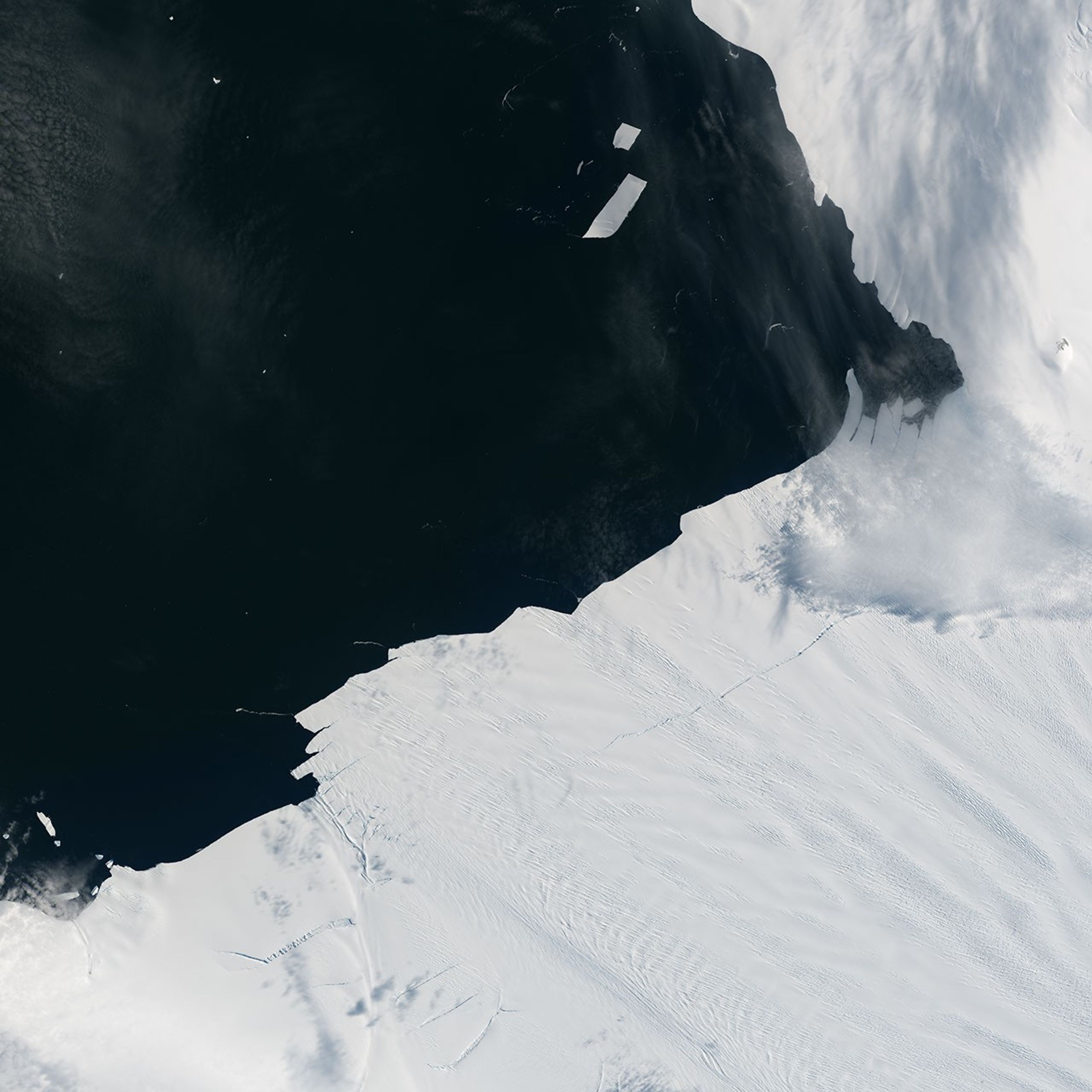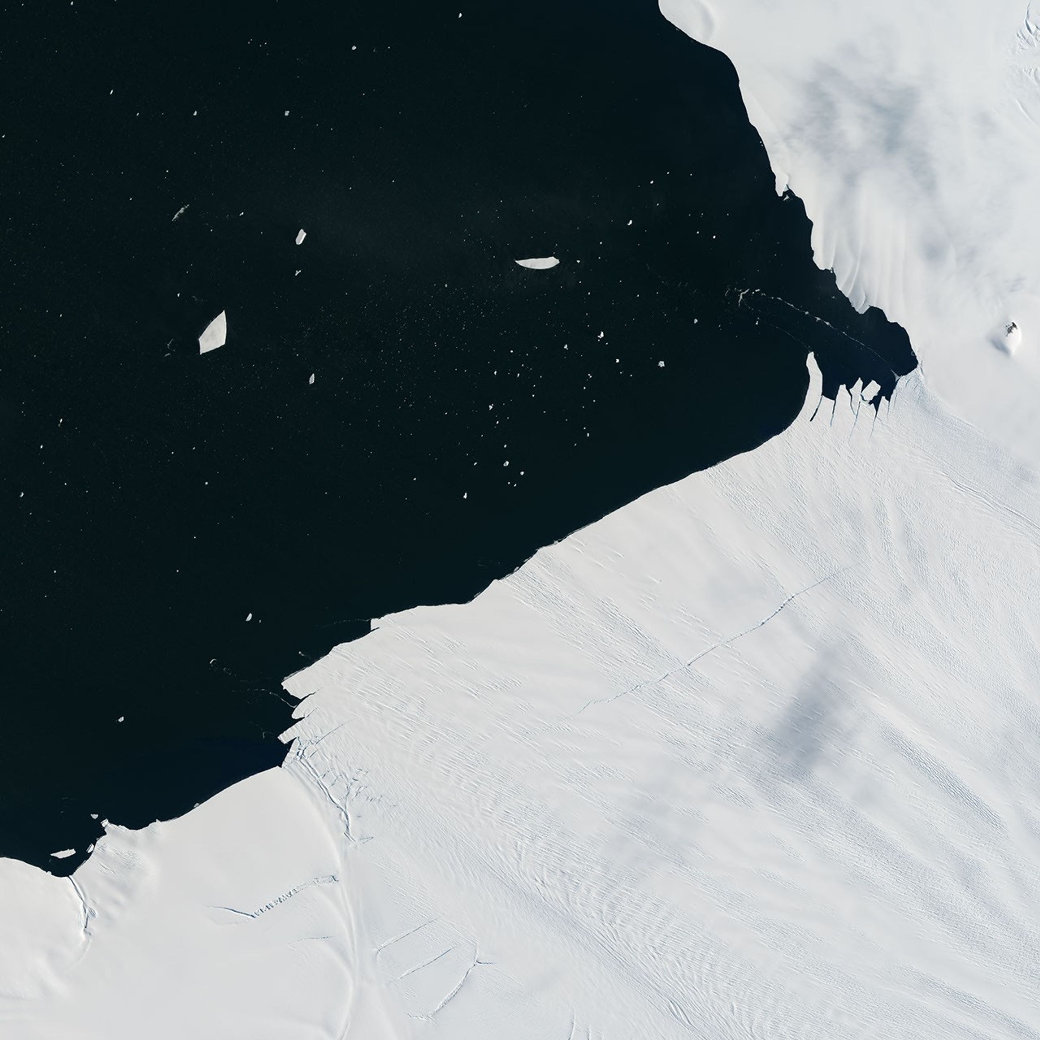 The animation above shows a wider view of the area. The sequence, composed from images acquired January 25–29 by the Moderate Resolution Imaging Spectroradiometer (MODIS) on NASA’s Terra satellite, shows the berg when it first broke and then as it drifts in the bay. According to Ian Howat, a glaciologist at Ohio State University, the event was about 10 times smaller than in July 2015, when a 30-kilometer-long (20-mile) rift developed below the ice surface, then broke through and calved an iceberg spanning 583 square kilometers (225 square miles).