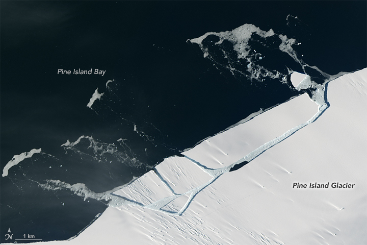 Pine Island is one of the main glaciers responsible for moving ice from the interior of the West Antarctic Ice Sheet to the ocean. It already delivers plenty of ice to Pine Island Bay—about 79 cubic kilometers (19 cubic miles) of ice per year. But scientists watch this glacier closely because the evidence has been pointing to even faster loss of ice in the future. Such a retreat would lessen the shelf’s buttressing effect, allowing more inland ice to flow out to the ocean, where it ultimately melts and contributes to sea level rise.