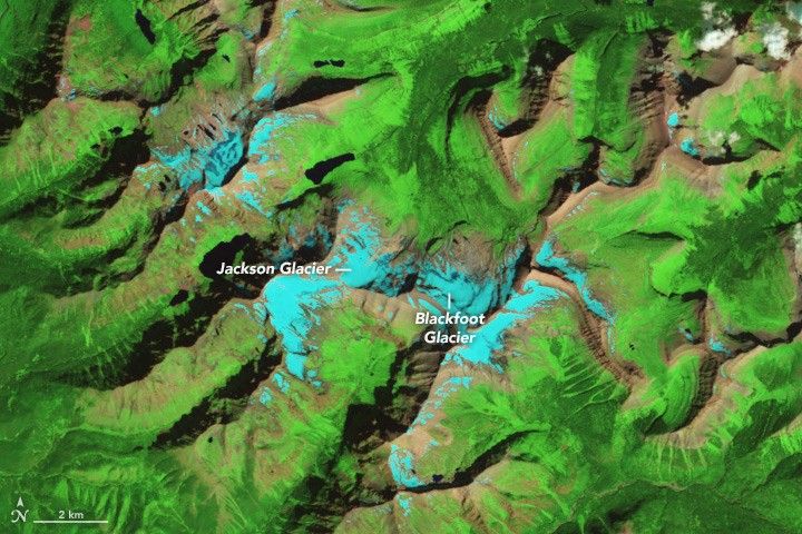 Before these images were acquired, glaciers in the basin had already decreased from 21.6 square kilometers (8.3 square miles) in area in 1850 to just 7.4 square kilometers (2.9 square miles) in 1979. The Blackfoot and Jackson glaciers once ran together, as this photograph from 1914 shows; by 2009, they had retreated into separate valleys.