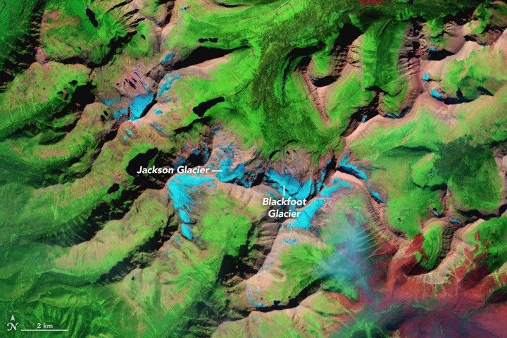 Before these images were acquired, glaciers in the basin had already decreased from 21.6 square kilometers (8.3 square miles) in area in 1850 to just 7.4 square kilometers (2.9 square miles) in 1979. The Blackfoot and Jackson glaciers once ran together, as this photograph from 1914 shows; by 2009, they had retreated into separate valleys.