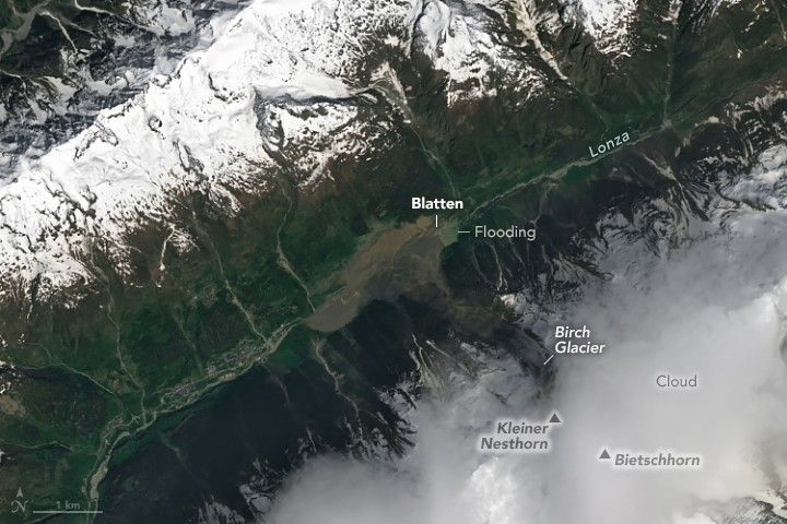 On the afternoon of May 28, 2025, an avalanche of rock and ice from the Birch Glacier (Birchgletscher) in southwestern Switzerland roared into the valley below. Debris buried most of the village of Blatten and dammed the Lonza, causing the river to flood. The event occurred after rock from a crumbling mountain peak built up on the glacier, which likely contributed to its ultimate collapse.