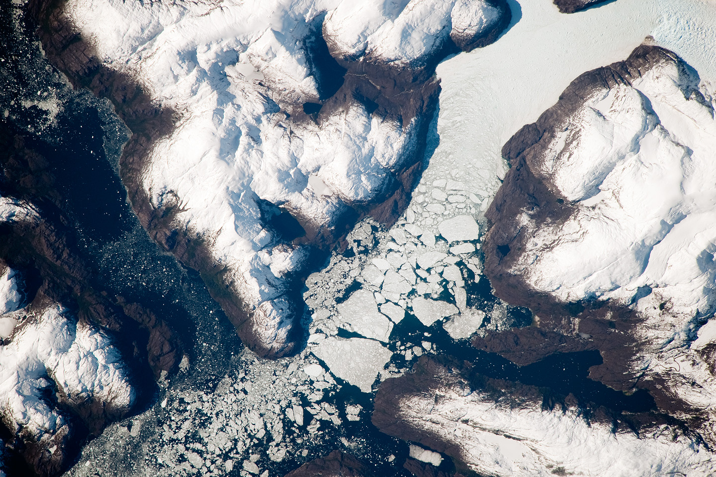 This detailed astronaut photograph shows the merged outlet of Penguin Glacier and HPS 19 into a fjord carved into the snow-covered mountains of the southern Andes. The designation HPS stands for Hielo Patagónico Sur (Southern Patagonian Icefield); the numbering system is used to identify glaciers that have no other geographic name. Ice flowing into the fjord begins to break up at image center, forming numerous icebergs. The largest visible in this image is approximately 2 kilometers in width. The large ice masses visible at image center have a coarse granular appearance due to variable snow cover and mixing and refreezing of ice fragments prior to floating free.