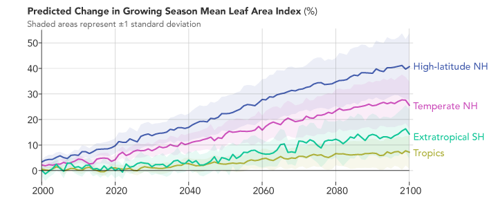 According to climate models, the future looks even greener. The second map shows what the green-up might look like in the future based on the Coupled Model Intercomparison Project (CMIP5) climate model, under a scenario in which increases in greenhouse gases lead to almost 5° Celsius (9° Fahrenheit) of warming by the end of the 21st century. Specifically, it shows the predicted change in the growing season’s “leaf area index” from 2081-2100 relative to 1981-2000. The chart below the map shows the predicted changes by latitude. Notice that high latitudes in the Northern Hemisphere are still expected to change the most.