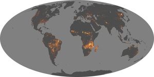 Some of the global patterns that appear in the fire maps over time are the result of natural cycles of rainfall, dryness, and lightning. For example, naturally occurring fires are common in the boreal forests of Canada in the summer. In other parts of the world, the patterns are the result of human activity. For example, the intense burning in the heart of South America from August-October is a result of human-triggered fires, both intentional and accidental, in the Amazon Rainforest and the Cerrado (a grassland/savanna ecosystem) to the south. Across Africa, a band of widespread agricultural burning sweeps north to south over the continent as the dry season progresses each year. Agricultural burning occurs in late winter and early spring each year across Southeast Asia.