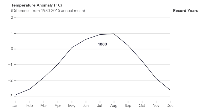 The animated figure above shows global temperature anomalies for every month since 1880, a result of the Modern-Era Retrospective analysis for Research and Applications, version 2 (MERRA-2) model run by NASA’s Global Modeling and Assimilation Office. Each line shows how much the global monthly temperature was above or below the annual global mean from 1980–2015. The column on the right lists each year when a new global record was set.
