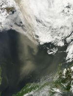 The thickest dust plume over the Sea of Japan extends primarily north-south. In the north, the sand mingles with clouds. East of the main dust plume, a thinner veil of dust skirts the Japanese coast, and some dust may hover over that island. Closer to the Korean Peninsula, skies appear clear.