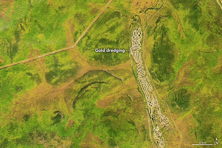 Not all of the region’s gold shows up as lode deposits. In areas where a lode has been eroded, pieces of gold can become concentrated by rivers and streams into placer deposits. The second image, centered west of the town of Nizhny Kuranakh, shows the excavation site of buried placer along a tributary of the Aldan River.