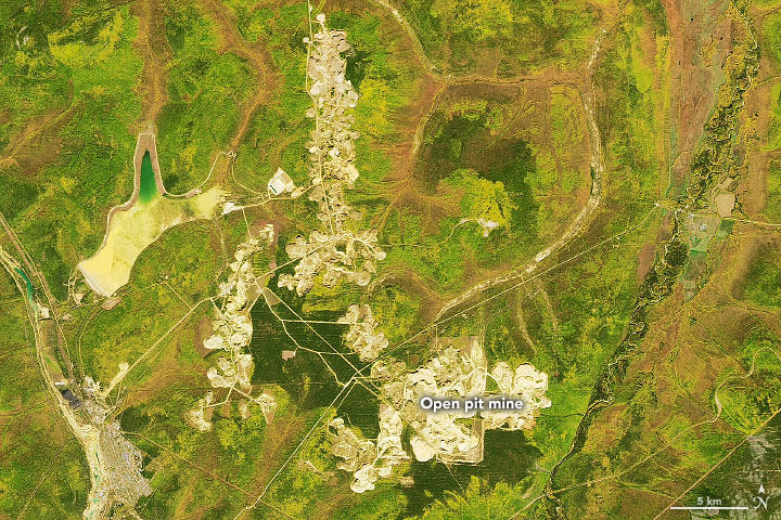 Central Aldan is one of Russia’s largest gold ore districts, with the mineral occurring in numerous deposits, or “lodes,” in the fractured rock. One of the largest lodes lies in the Kuranakh deposit, a shallow, ribbon-like orebody (up to 50 meters thick and 25 kilometers long) sandwiched between Cambrian limestone below and Jurassic sandstone above. A mining site developed to to extract this gold is visible in the detailed image below.