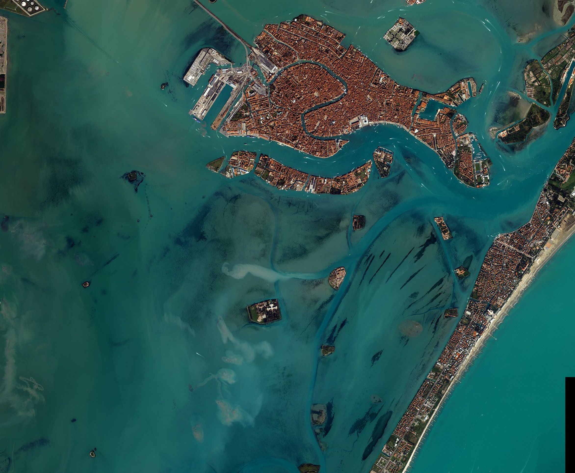 The Grand Canal curves in a great “S” through the heart of the red tile roofs of Venice, Italy, in this Ikonos image, acquired on April 2, 2001. The Canal is the main thorough-fare through the city, which is built on 118 tiny islands linked by canals and bridges. The city sits in the center of the Laguna Venetta, three kilometers from the Italian mainland and three kilometers from the Adriatic Sea. Boats, the primary form of transportation, can be seen as small white strips in the Grand Canal and the water around the island. In the large image, the causeway leading to the mainland stretches northwest from the island. The narrow length of land east of Venice, which is covered by the city of Lido, separates the Laguna from the Adriatic.