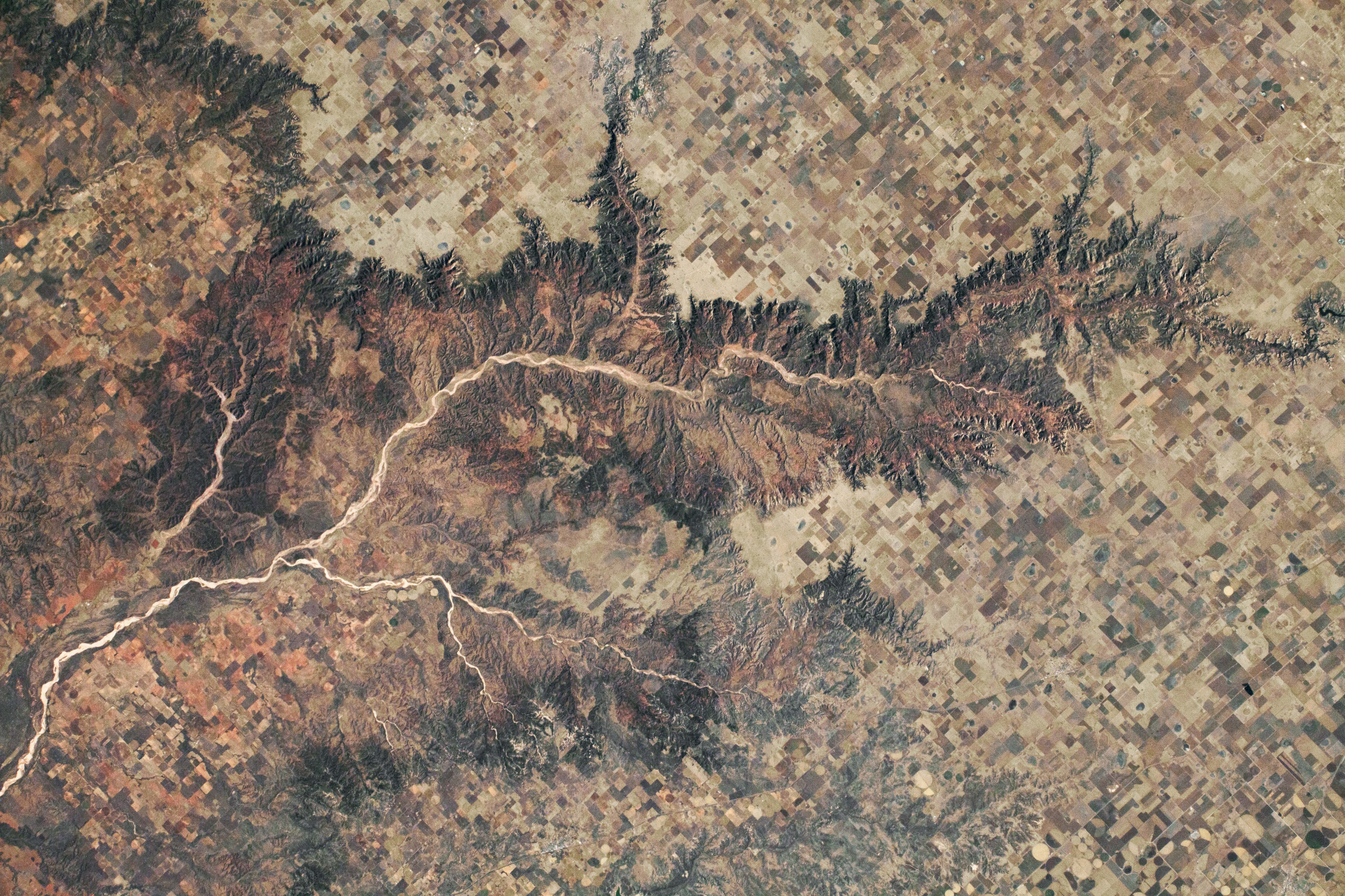 Dark, intricate canyon edges branch out into the High Plains, where agricultural fields and ranches tile the landscape. A fork of the Red River, named the Prairie Dog Town Fork Red River, runs through the canyons. (Note that the photo has been oriented with north toward the bottom in order to prevent relief inversion by the shadows.)