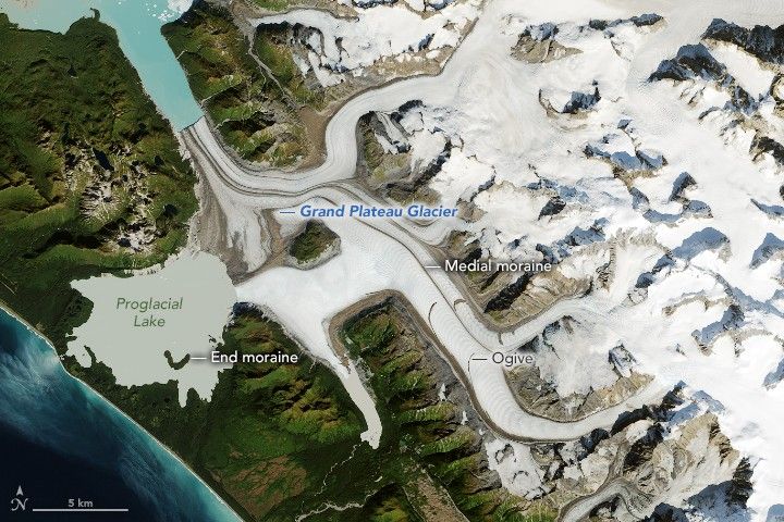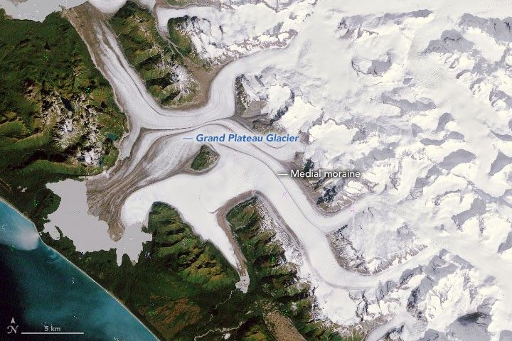 Ice was already retreating before satellites were there to observe it. At its maximum extent during the Little Ice Age, Grand Plateau Glacier reached all the way to the Pacific Ocean coastline. Since then, it has progressively retreated from a series of end moraines--debris shoveled into a heap at the front edge of the glacier when it was advancing.