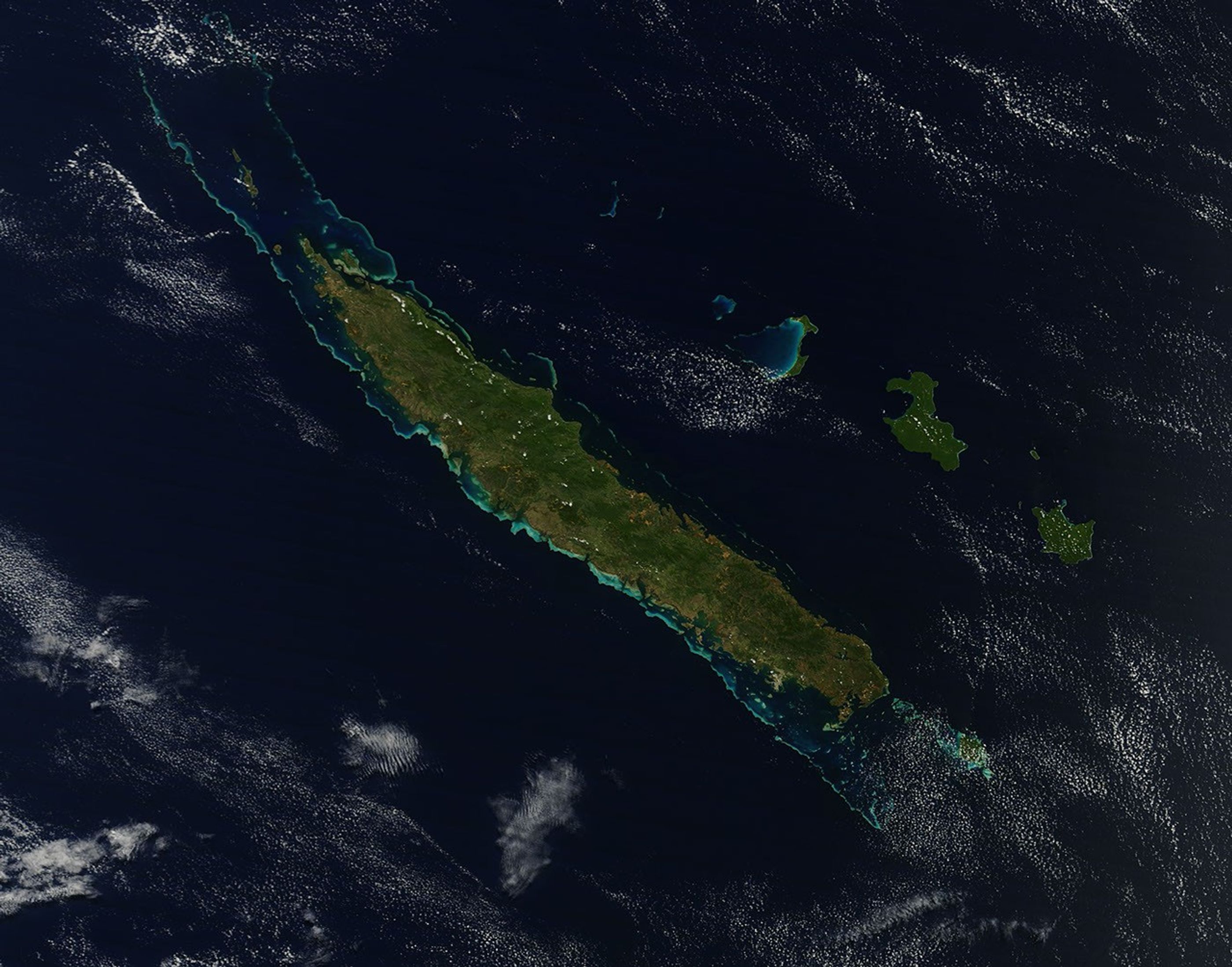 Roughly 1,300 kilometers (830 miles) east of Australia lies Grande Terre, the largest island of New Caledonia. The island is roughly 400 kilometers (250 miles) long and ringed by a 1,600-kilometer (1,000-mile) coral reef.
