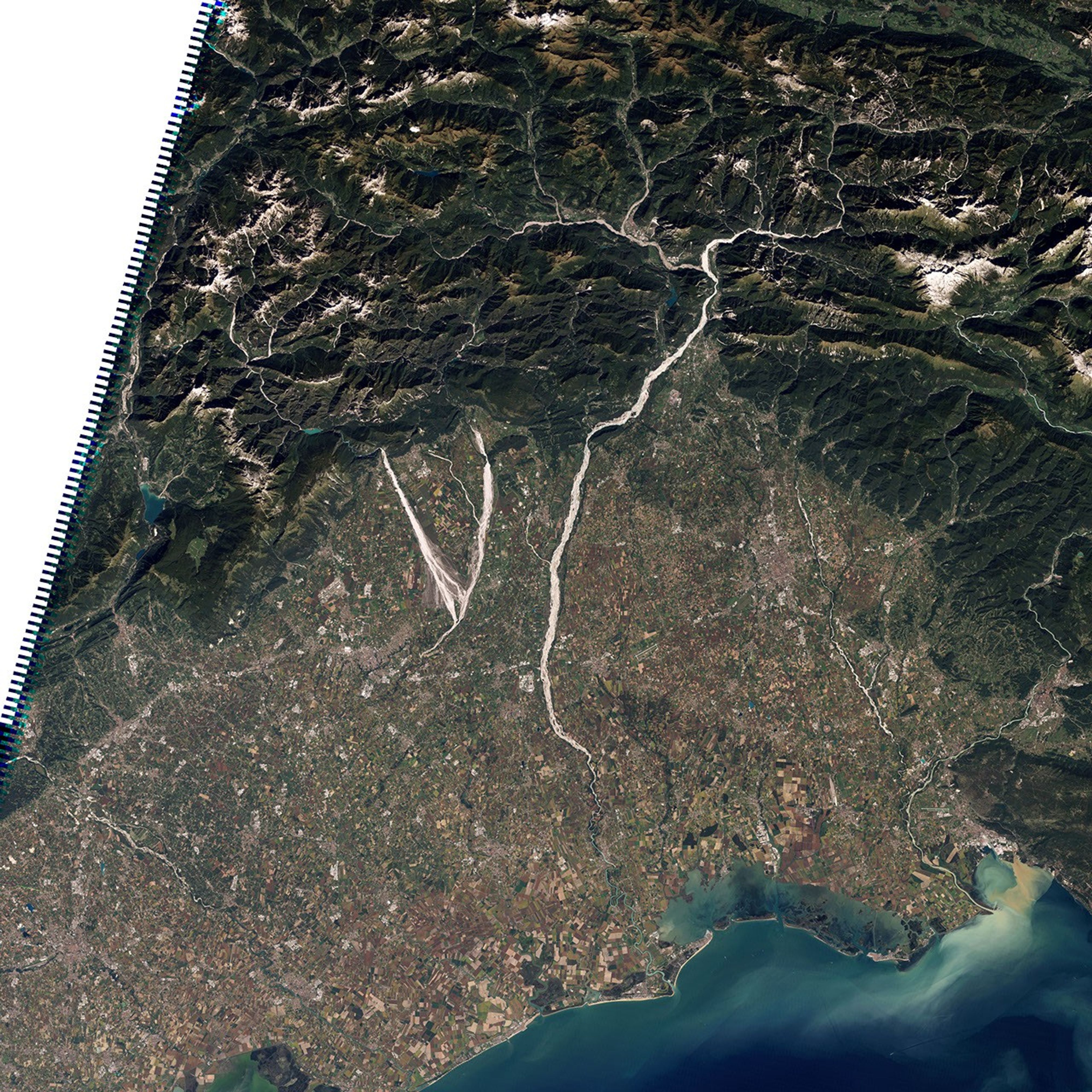 In northeastern Italy, the Cellina, Meduna, and Tagliamento Rivers flow in unison toward the Adriatic Sea. Fed by streams from nearby mountains, these gravel-bottomed rivers flow over a plain packed with farms. The Thematic Mapper on NASA’s Landsat 5 satellite captured this natural-color image of the region on September 21, 2010.