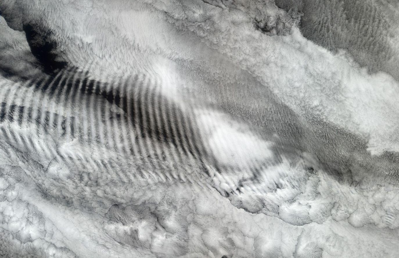 In this natural-color image from the Multi-angle Imaging SpectroRadiometer (MISR), a fingerprint-like gravity wave feature occurs over a deck of marine stratocumulus clouds. Similar to the ripples that occur when a pebble is thrown into a still pond, such “gravity waves” sometimes appear when the relatively stable and stratified air masses associated with stratocumulus cloud layers are disturbed by a vertical trigger from the underlying terrain, or by a thunderstorm updraft or some other vertical wind shear. The stratocumulus cellular clouds that underlie the wave feature are associated with sinking air that is strongly cooled at the level of the cloud-tops—such clouds are common over mid-latitude oceans when the air is unperturbed by cyclonic or frontal activity. This image is centered over the Indian Ocean (at about 38.9° South, 80.6° East), and was acquired on October 29, 2003.