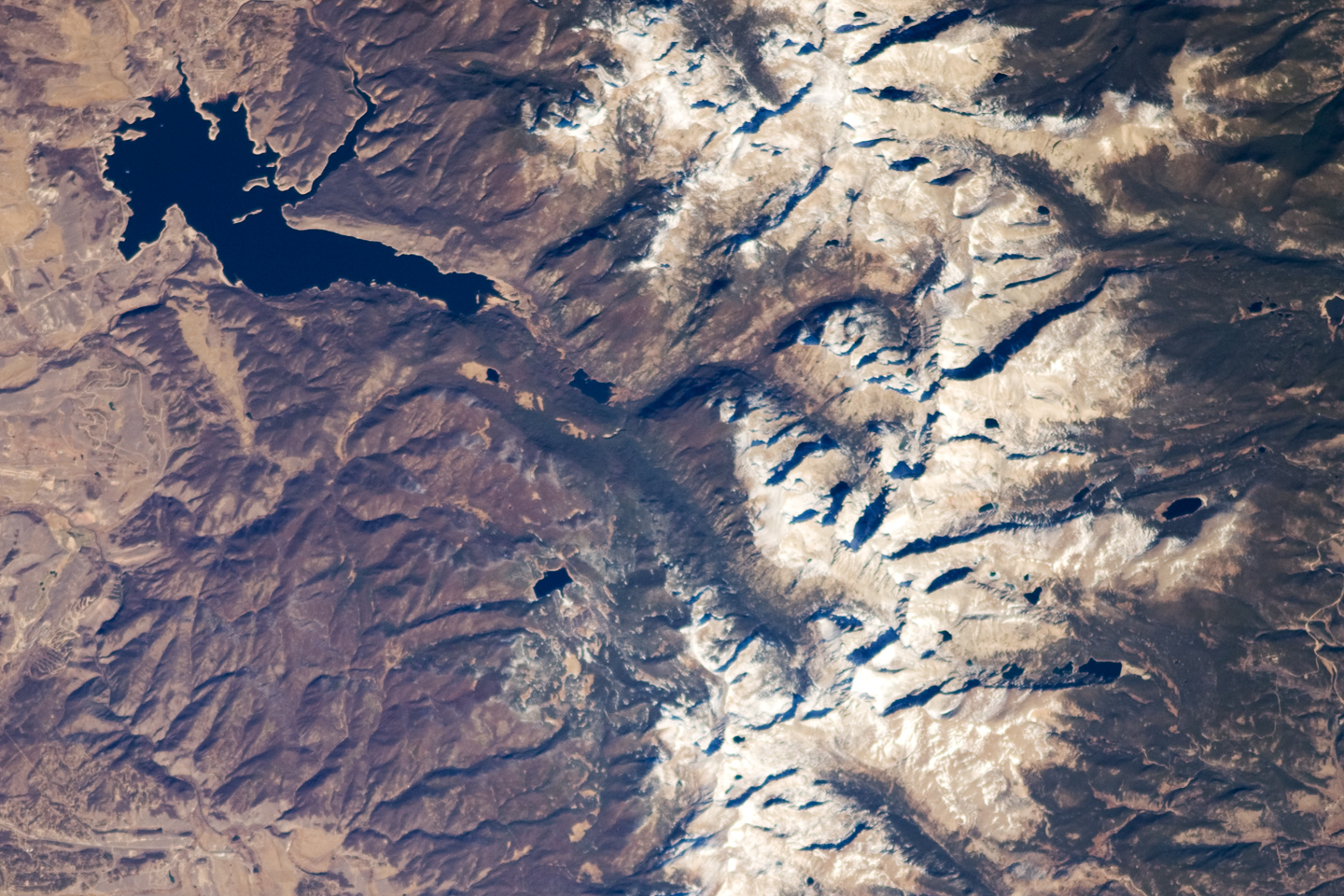 This astronaut photograph highlights a portion of the Great Divide in the Rocky Mountains approximately 31 kilometers due west of Boulder, Colorado. The Great Divide is one of four continental divides recognized by geographers and hydrologists in North America—the others being the Northern, Eastern, and Saint Lawrence Seaway Divides—but it is still generally (and erroneously) known as the Continental Divide. The Great Divide is a hydrologic boundary defined by the ultimate destination of precipitation; rainfall on the western side of the Divide flows to the Pacific Ocean, while rainfall on the eastern side flows to the Gulf of Mexico. It is easy to visualize such a boundary traced along the high ridges of the Rocky Mountains (dashed line), but in regions of less obvious topography, more detailed study of the local geomorphology and hydrology are required to map the location of the Divide.