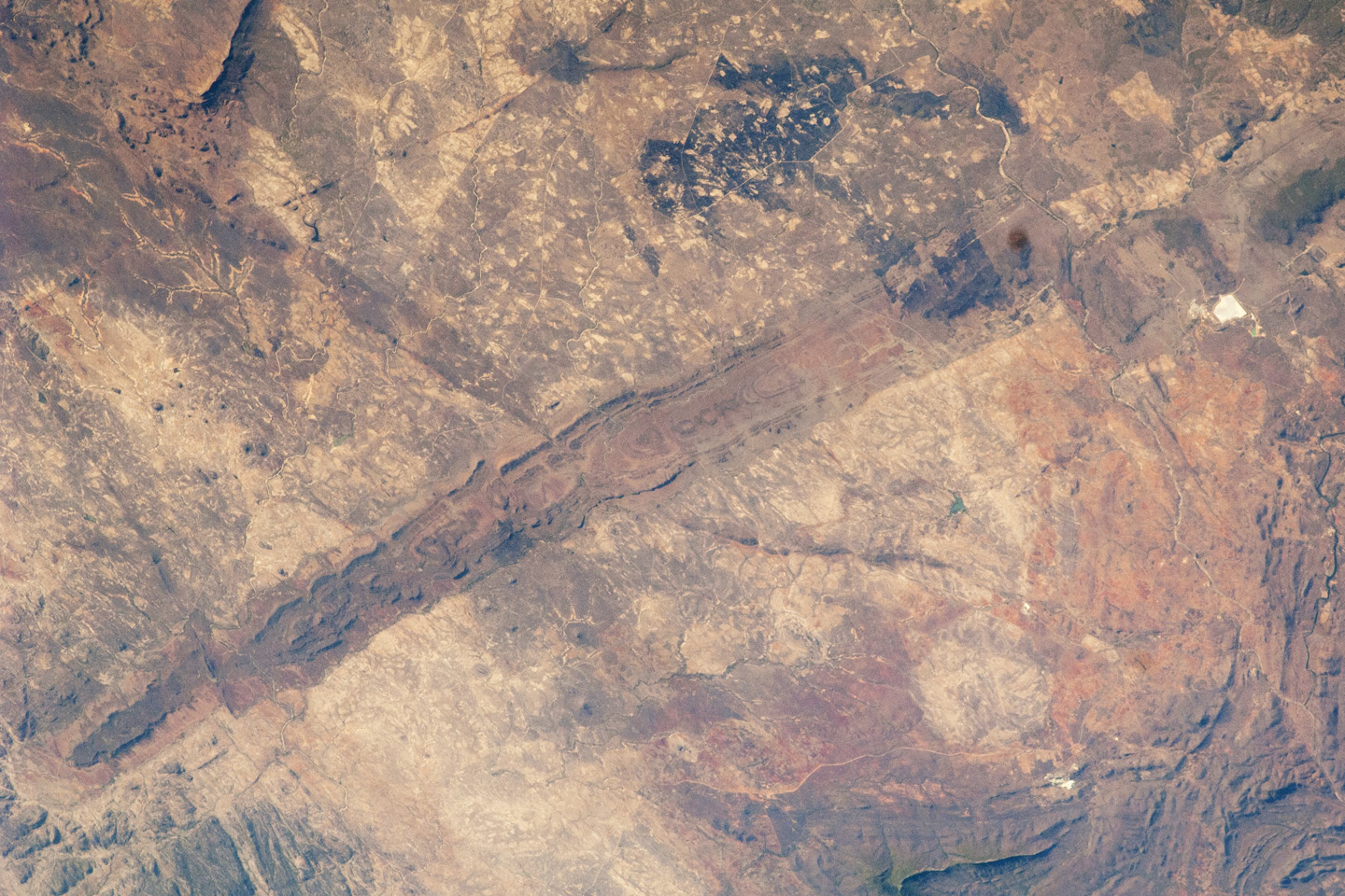 This geological feature extends more than 550 kilometers (342 miles) northeast to southwest across the center of Zimbabwe, varying from 3 to 12 kilometers (2-8 miles) in width. The southern end of the dyke is captured in this astronaut photograph.