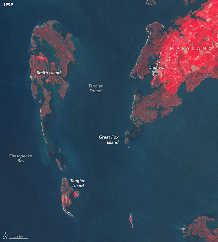 The pair of satellite images above highlight how much the island has changed. In 1999, a small island to the south offered some protection to Great Fox. By 2019, it was gone, as were other marshlands that had ringed the island. The images were acquired by the Enhanced Thematic Mapper Plus (ETM+) on Landsat 7 and the Operational Land Imager (OLI) on Landsat 8.