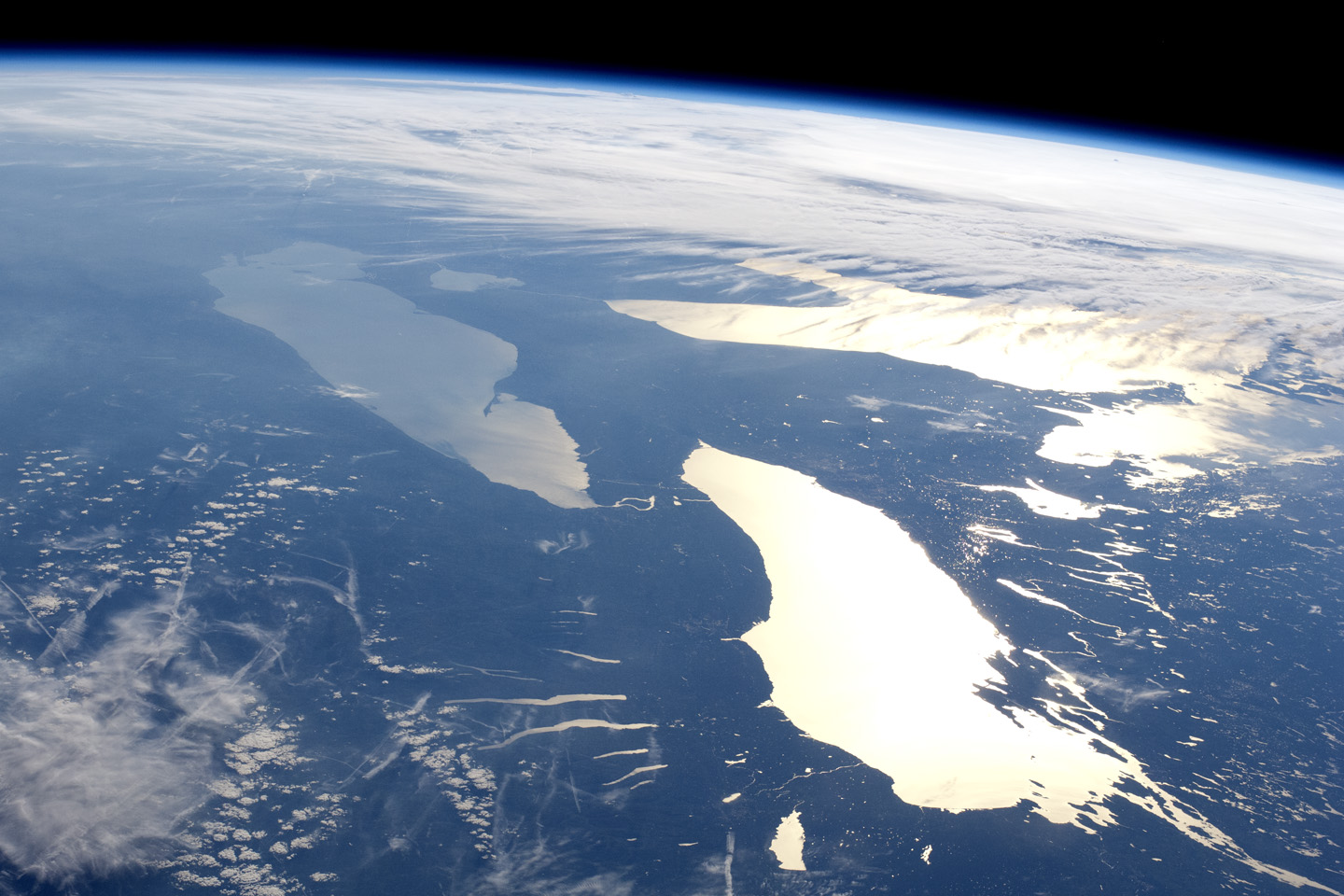 If the viewing and lighting conditions are ideal, that mirror-like surface can extend over very large areas, such as the entire surface of Lake Ontario (approximately 18,960 square kilometers). This astronaut photograph was taken while the ISS was located over a point to the southeast of Nova Scotia, approximately 1,200 kilometers (740 miles) ground distance from the centerpoint of the image. Lake Ontario, Lake Huron, the Finger Lakes of New York, and numerous other bodies of water appear brilliantly lit by sunglint. To the west, Lake Erie is also highlighted by sunglint, but less light is being reflected towards the astronaut observer, resulting in a duller appearance.
