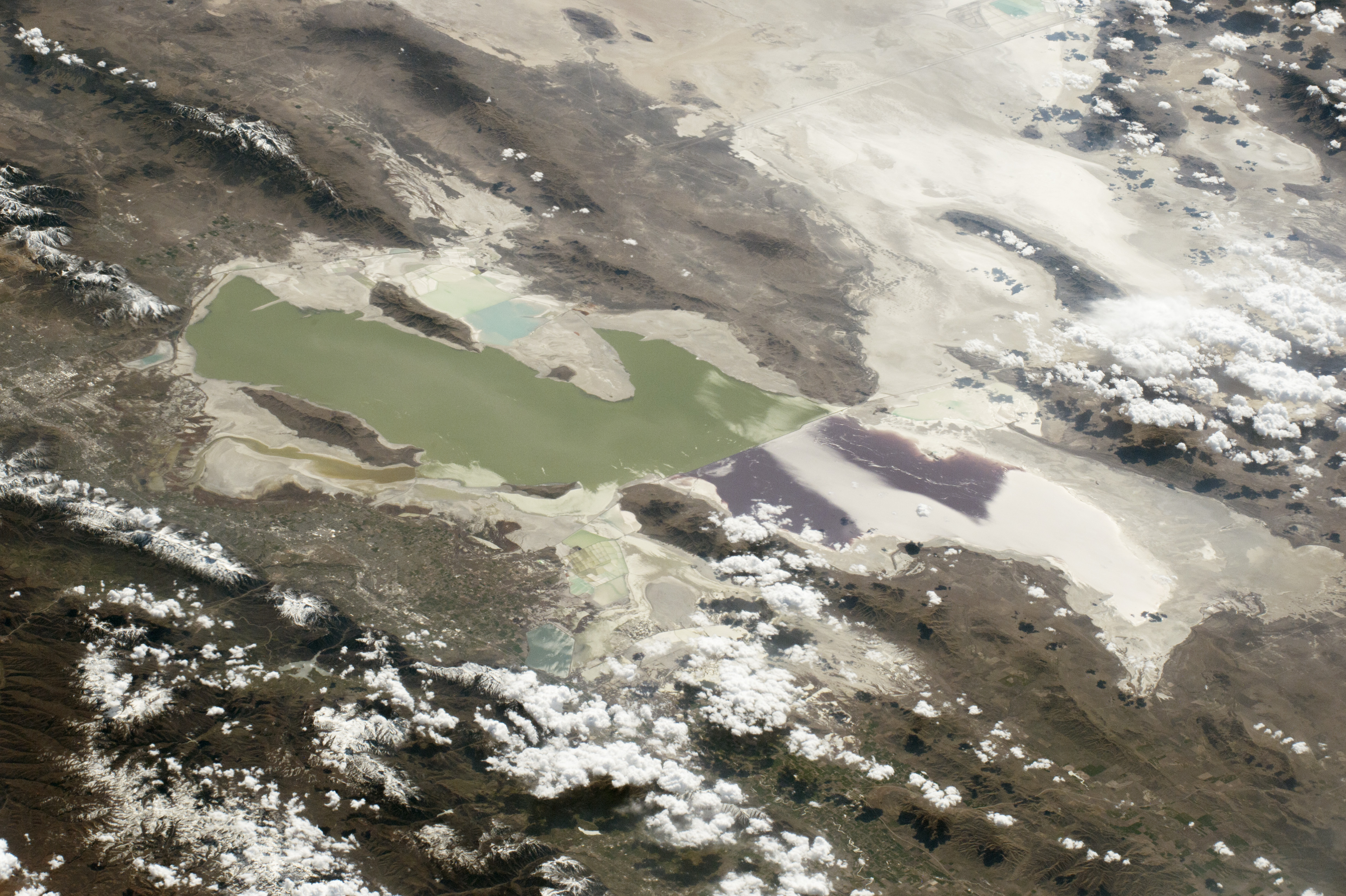 While passing over the Rocky Mountains, an astronaut aboard the International Space Station took this photograph of the Great Salt Lake and the Bonneville Flats. As seen from orbit, the lake is unique because its two halves are different colors and because the railroad causeway that divides it is aligned exactly east-west.