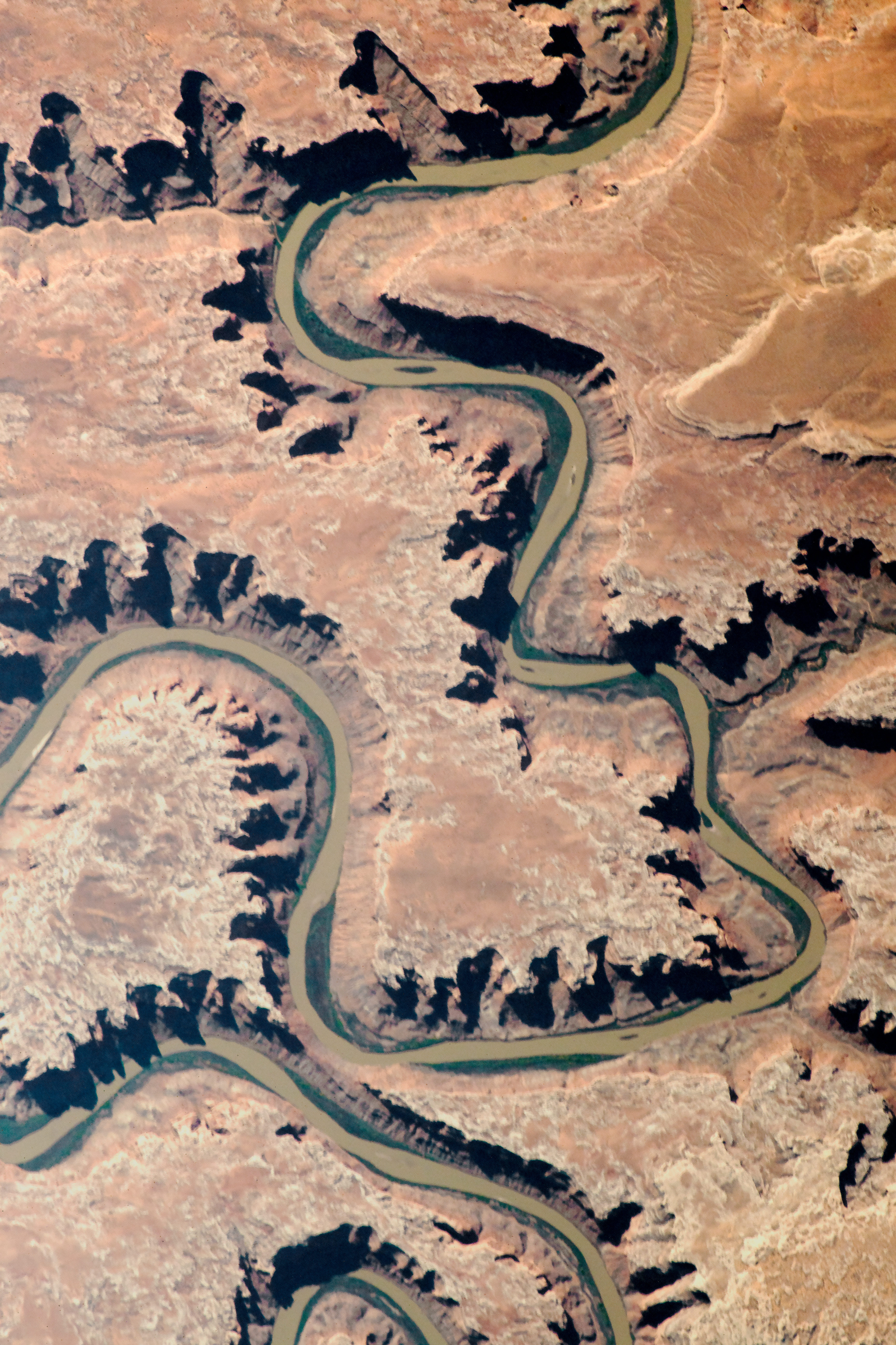 An astronaut aboard the International Space Station shot this photograph of the Green River flowing through red rock canyons in eastern Utah. A main tributary of the Colorado River, the Green flows 730 miles (1175 kilometers) through Wyoming, Colorado, and Utah. The portion of the Green River in this image is just north of Canyonlands National Park.