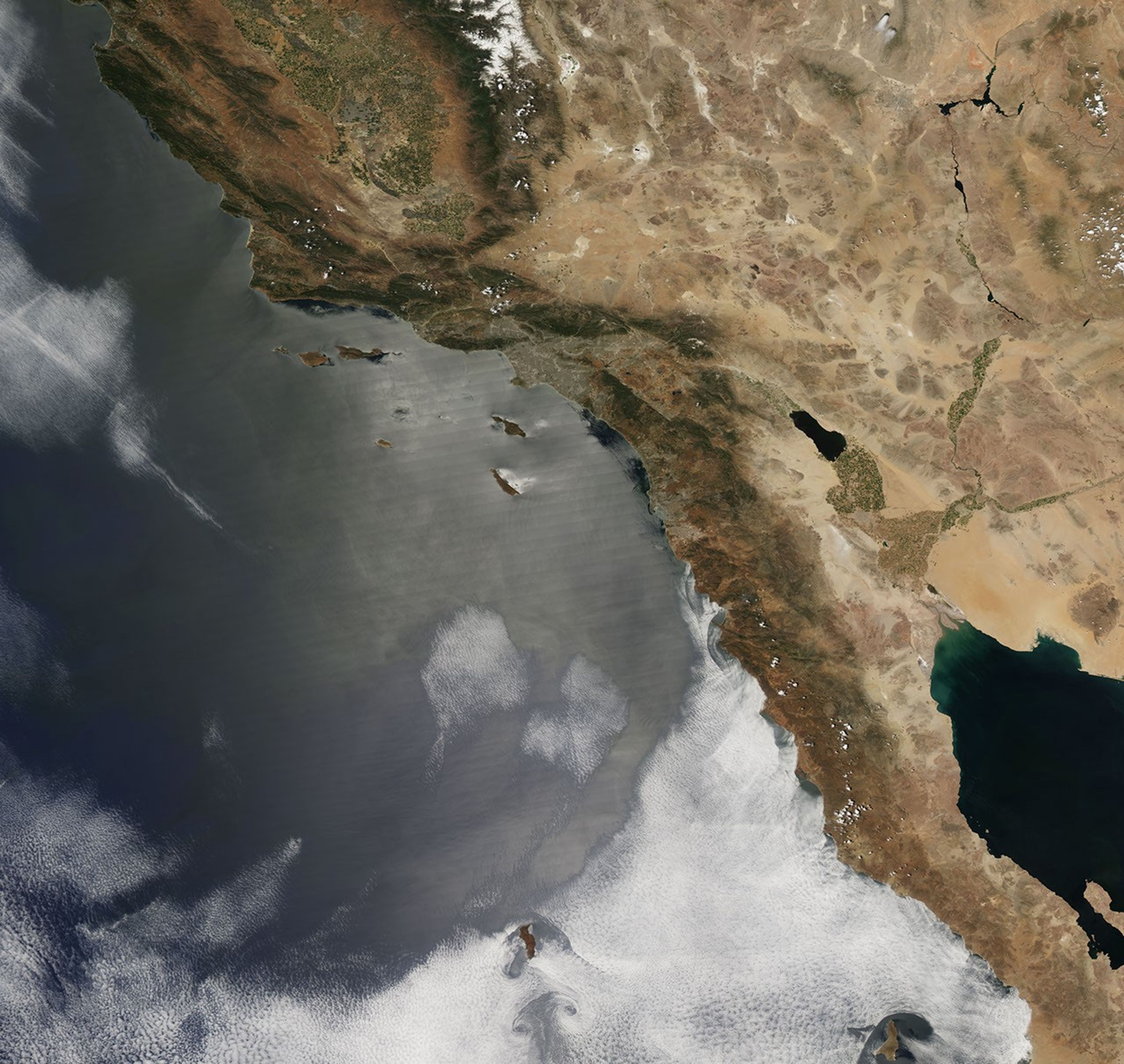 The Moderate Resolution Imaging Spectroradiometer (MODIS) on NASA’s Terra and Aqua satellites collected these observations of the area. Terra acquired the top image on October 28, 2007, and Aqua acquired the bottom images on March 3 and May 17, 2008. The top image is made from a combination of visible and infrared light to show the extent of the wildfires. Urban areas appear gray, unburned vegetated areas appear bright green, and burned areas appear brick red. The bright red-pink specs in the burned areas suggest lingering flames. The bottom images are photo-like images of the area the following year. Whereas much of the area appears deep green on March 3, brown predominates on May 17, shortly after the spring rains ended.